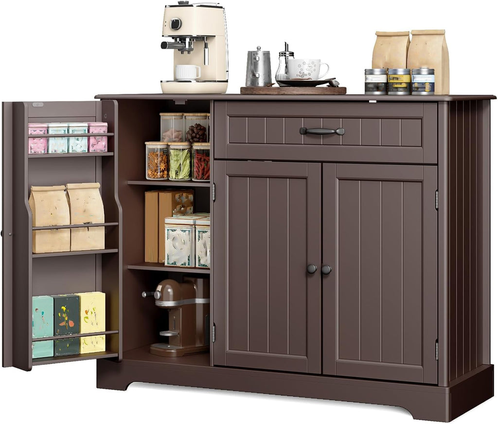 This multifunctional buffet cabinet is designed to keep your space tidy while adding a touch of modern style. With its spacious storage options—including an open top for appliances, internal shelves, a handy drawer, and a large bottom cabinet—and sturdy, water-resistant construction, it’s perfect for use in the kitchen, dining room, bathroom, or laundry room. Whether you need a dedicated coffee station ☕, a sleek pantry for canned goods 🥫, or a stylish sideboard for dinnerware 🍽️, this pantry cabinet has you covered. You’ll appreciate the easy-to-follow instructions with pictures and labeled parts that simplify assembly 🛠️, along with included anti-toppling kits for added safety and stability.