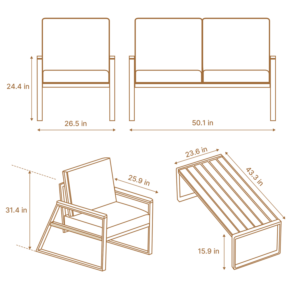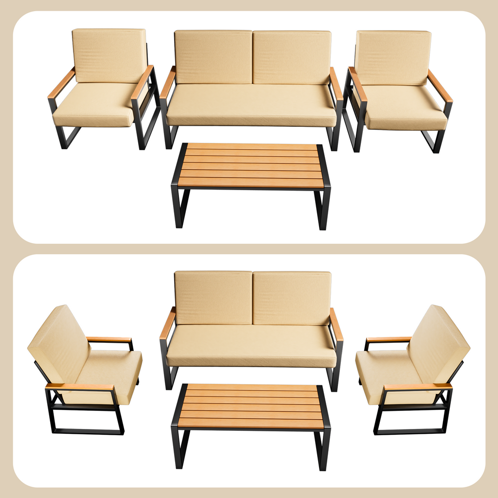 Transform your living space, bring home comfort and style with our outdoor furniture - a perfect blend of durability, comfort, and modern style! Designed for lasting enjoyment, the balcony furniture includes a two-seater sofa, two single chairs, and a coffee table with a weatherproof WPC tabletop. Whether you're hosting friends or unwinding solo, this set offers superior support with thick high-resilience cushions and a powder-coated iron frame built to withstand the elements. Plus, the removable, easy-clean cushion covers make maintenance a breeze!