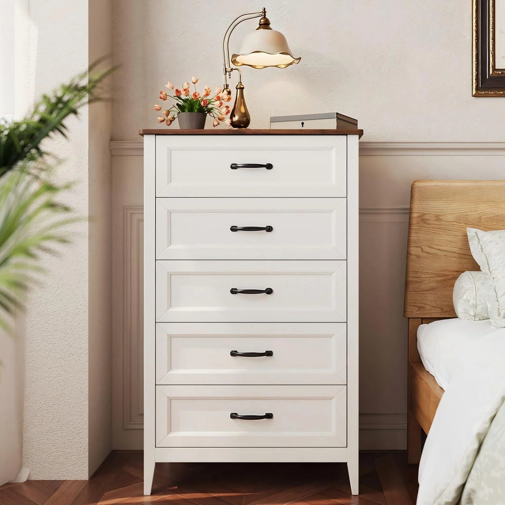 Lofka Farmhouse 5 Drawers Dresser for Bedroom, 45" Tall Wood Rustic Chest of Drawers with Wide Metal Handle, Natural Texture, Drawer Organizer for Bedroom, Living Room, White+Retro