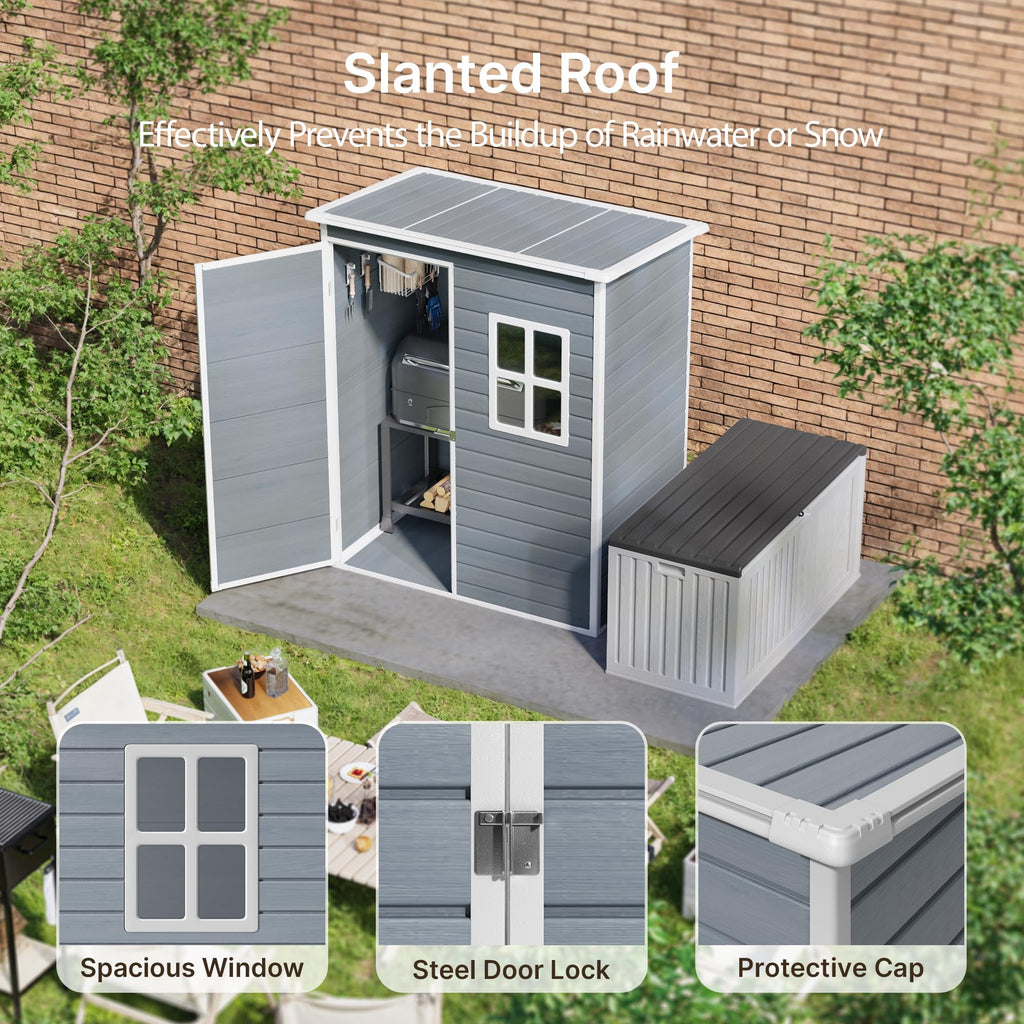 5 x 3 Ft Outdoor Storage Shed with Lockable Door, Aiho Resin Weatherproof Resin Garden Shed with Floor & Ventilation for Patio, Lawn, Gray