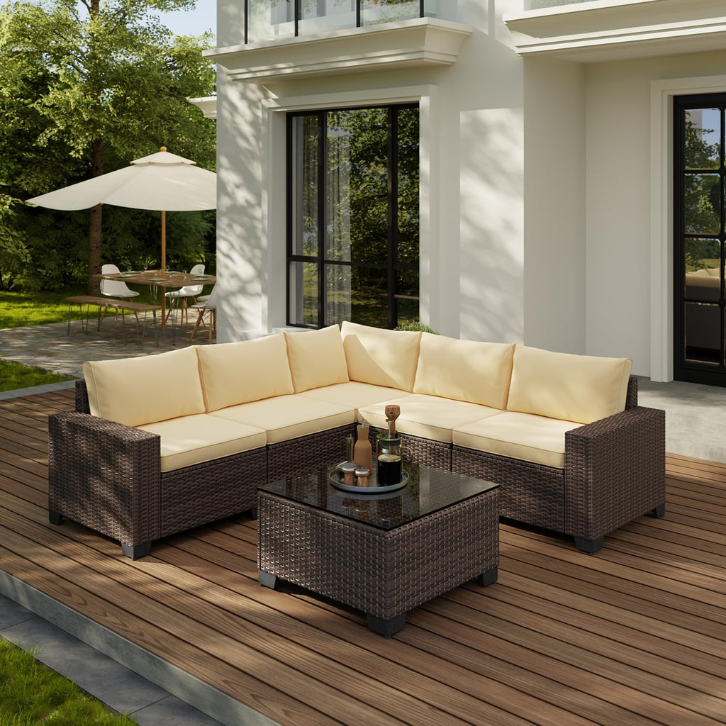 6-Piece Outdoor Patio Furniture Set, Pe Rattan Wicker Patio Sectional Conversation Sofa with Coffee Table for Garden, Backyard, Poolside, Lawn, Porch - Beige