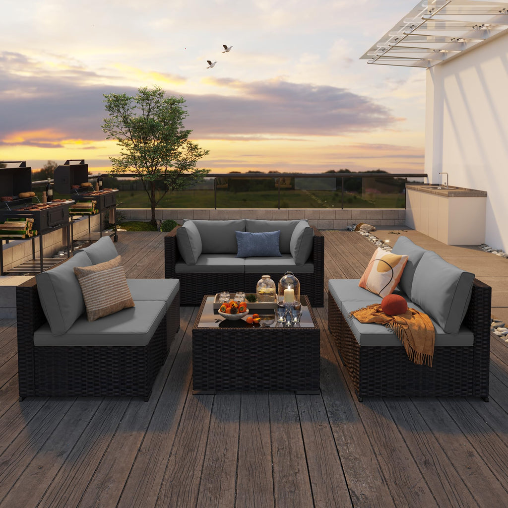 Aiho 7 Pieces Outdoor Sectional Sofa with Soft Cushions & Coffee Table, Pe Rattan Outdoor Patio Conversation Set, For Garden, Patio, Porch, Pool, Balcony, Backyard-Gray
