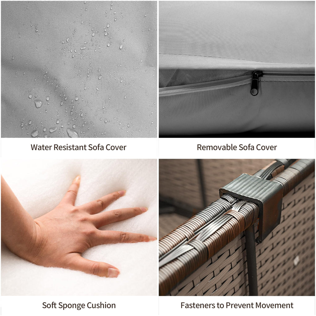 Transform your living space, bring home comfort and style with our outdoor furniture set — where timeless elegance meets modern durability. Designed for those who love to entertain or simply unwind in style, this outdoor patio set combines a sleek gray PE rattan weave with plush, weather-resistant cushions. Perfect for patios, gardens, balconies, or even cozy indoor spaces, the porch furniture is built to resist fading, cracking, and harsh weather while maintaining its beauty season after season. Plus, with modular pieces that you can configure freely, create a layout that fits your unique space effortlessly