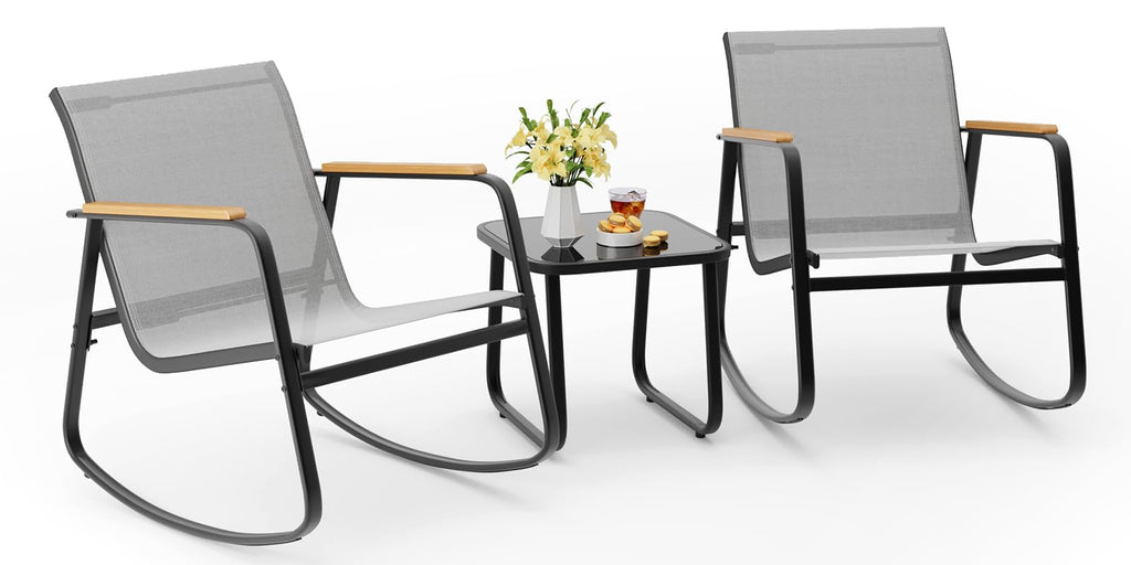 🏡 Transform Your Outdoor Space! Look no further than our Premium 3-Piece Patio Rocking Set, designed to offer the perfect blend of comfort, durability, and modern elegance. This set includes two ergonomic rocking chairs with smooth wooden armrests and a tempered glass side table, all crafted with rust-proof steel for long-lasting use. The breathable Textilene fabric ensures quick drying and comfortable seating, while the smooth rocking motion provides a relaxing experience. Perfect for any outdoor space, this porch set is easy to assemble and maintain, making it an ideal choice for your patio, garden, or poolside area.