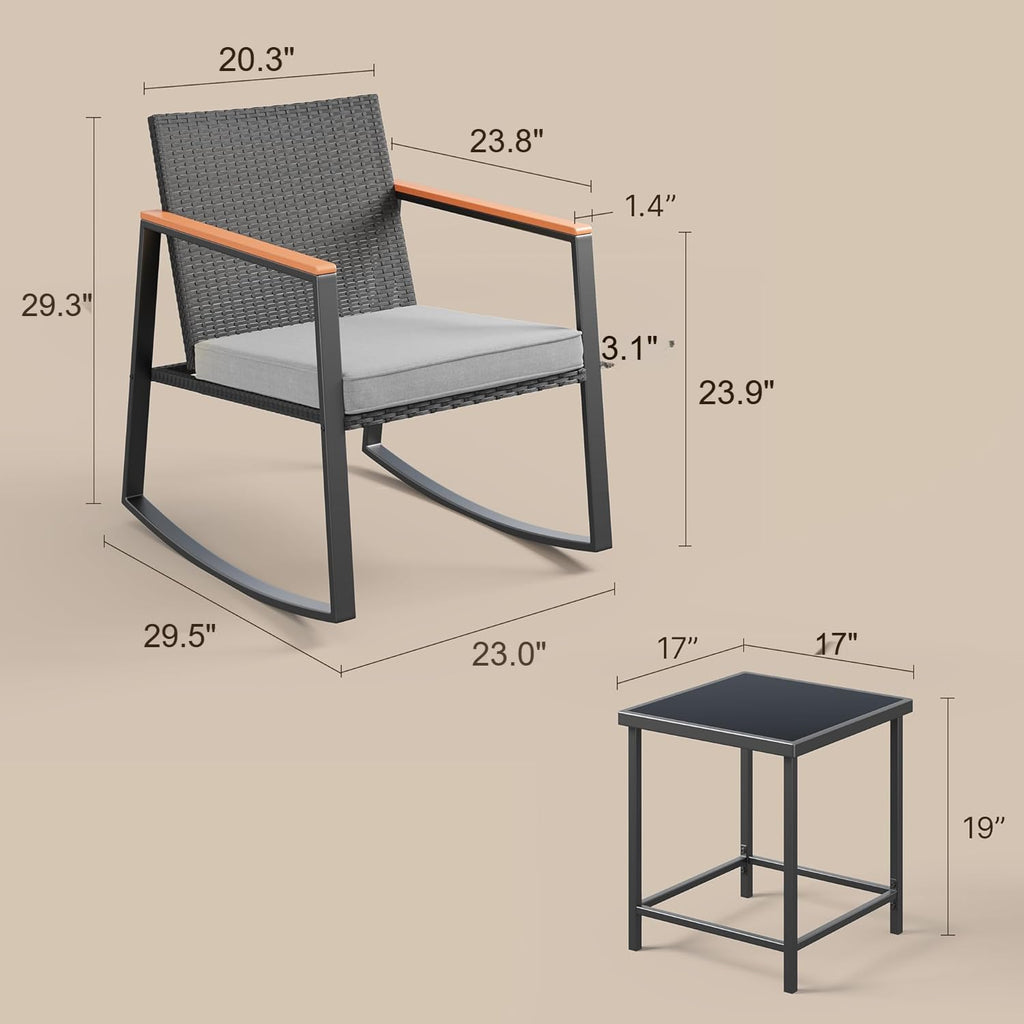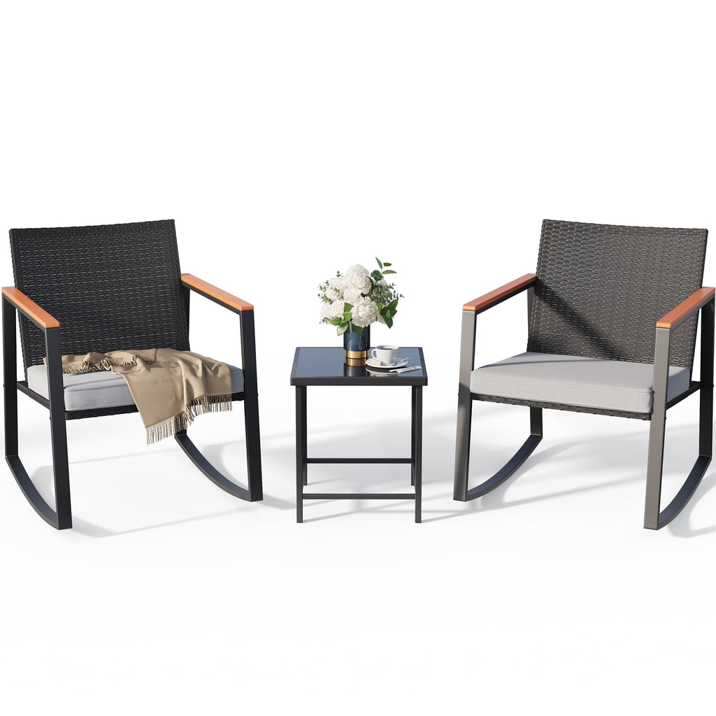 Aiho 3 Pieces Patio Furniture Set, Outdoor Wicker Rocking Chairs Set with Wooden Arm & Tea Table, Perfect for Garden, Yard, Gray