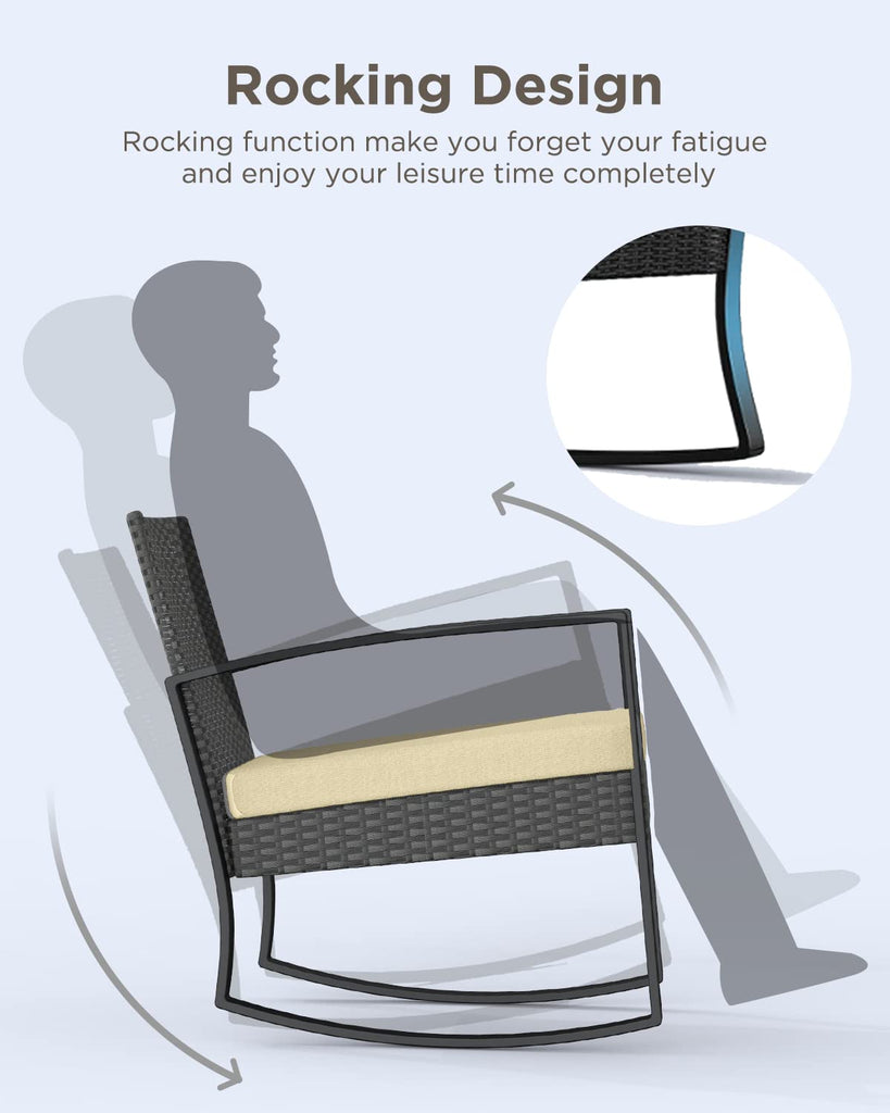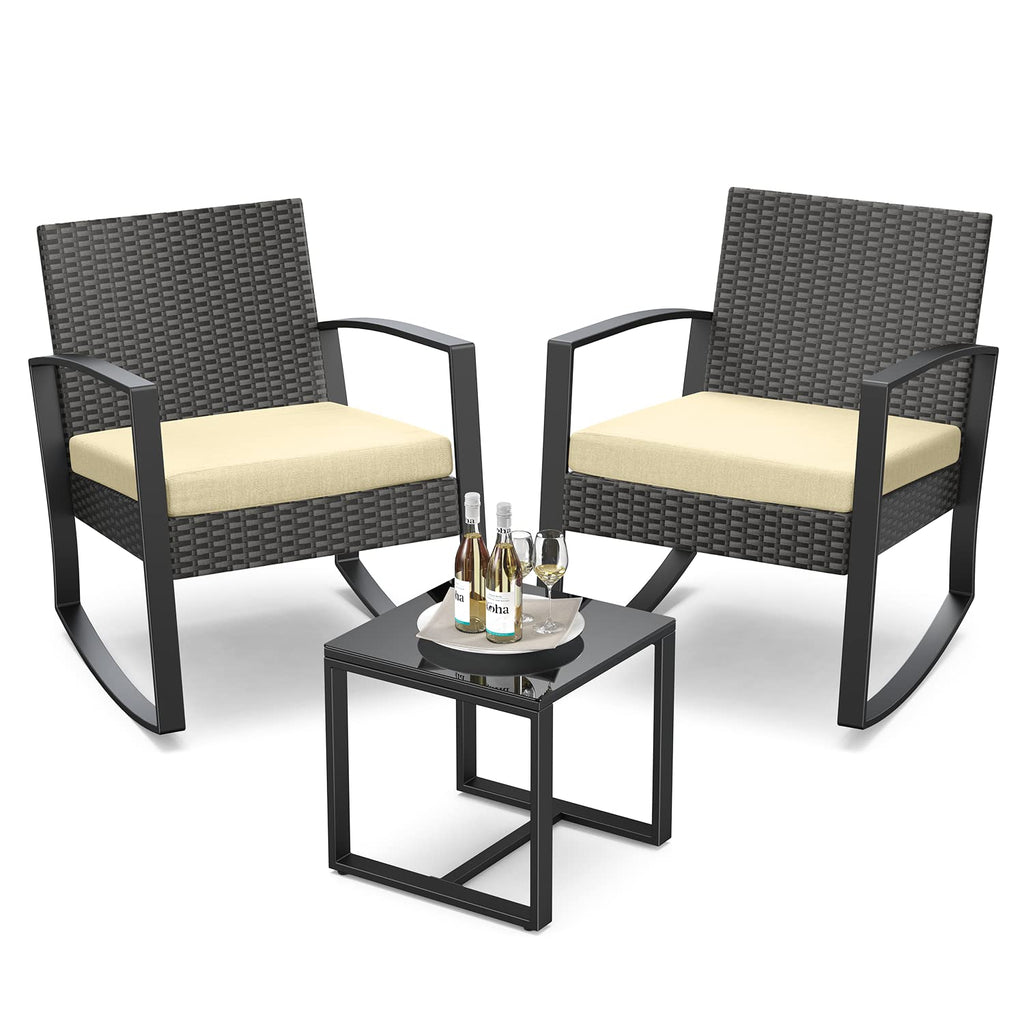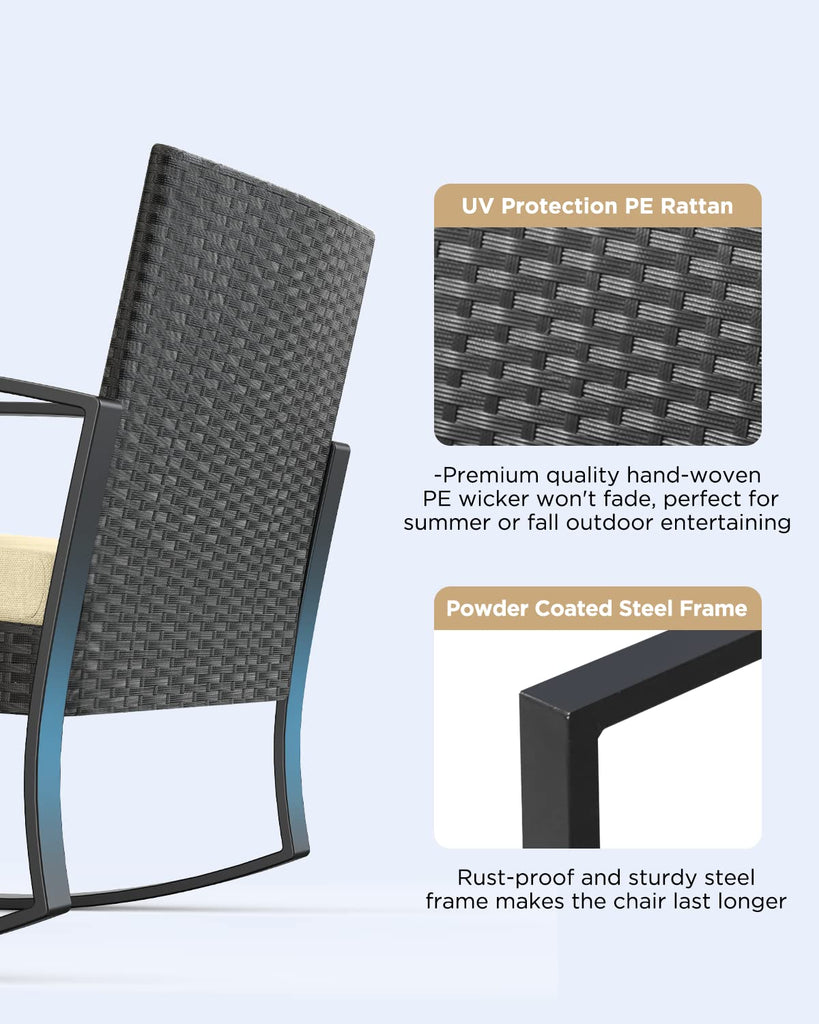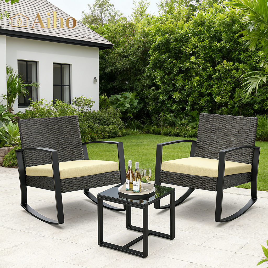 - Transform Your Living Space, bring home comfort and style with our outdoor chairs set of 3. Crafted with hand-woven PE wicker and a reinforced iron frame, the Aiho balcony furniture offers exceptional durability and timeless style. The ergonomic design in the outdoor table and chairs features a gentle rocking motion and high-resilience sponge padding, inviting you to unwind in total comfort. Whether placed on your patio, by the pool, or on a cozy balcony, these patio chairs support up to 250 lbs and are built to last through seasons of use.