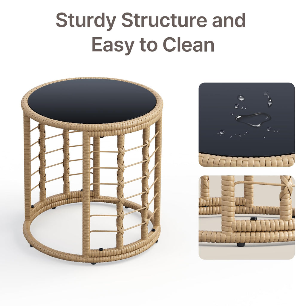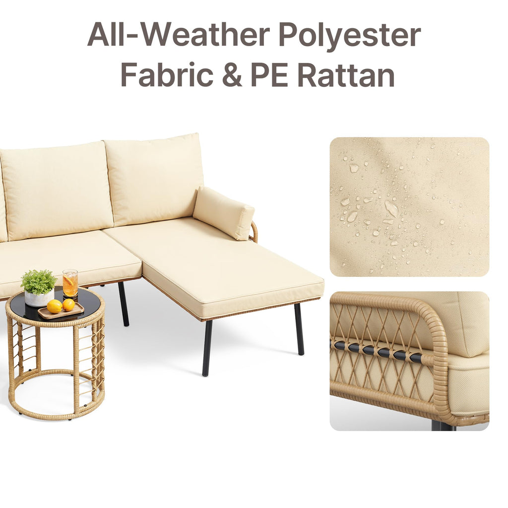 Aiho 3-Piece Outdoor Patio Conversation Set with All Weather PE Wicker, L-Shaped Outdoor Sectional Sofa with Soft Cushions & Glass Table, For Garden, Patio, Porch, Pool, Balcony, Backyard - Beige
