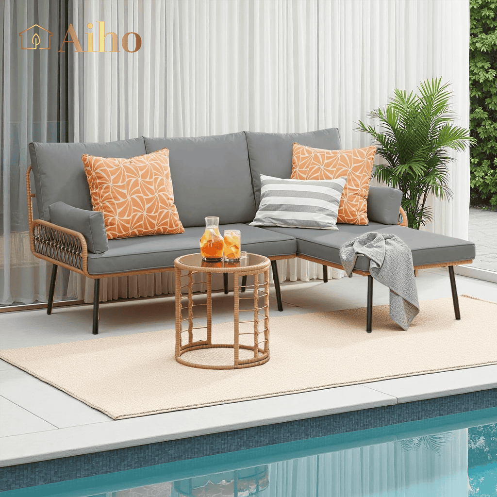 Aiho 3-Piece Outdoor Patio Conversation Set with All Weather PE Wicker, L-Shaped Outdoor Sectional Sofa with Soft Cushions & Glass Table, For Garden, Patio, Porch, Pool, Balcony, Backyard - Gray