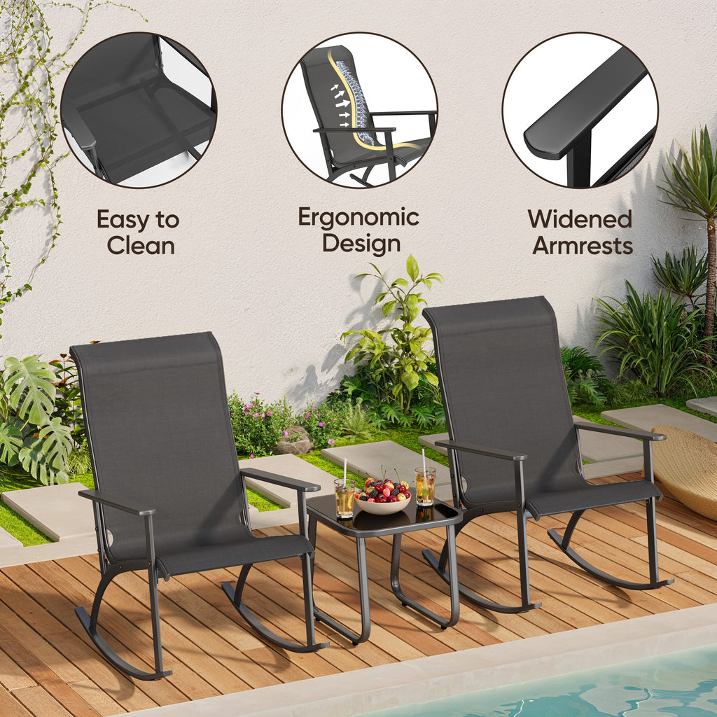 🔄【Comfortable Rocking Design】This patio bistro set features a rocking design, bringing you a fun and relaxing time, allowing you to unwind and enjoy leisurely moments outdoors.