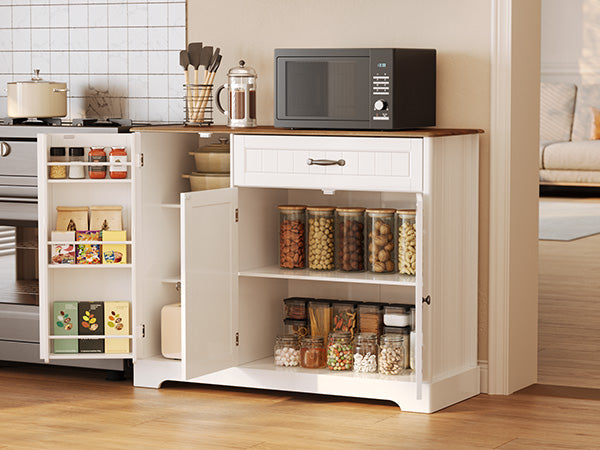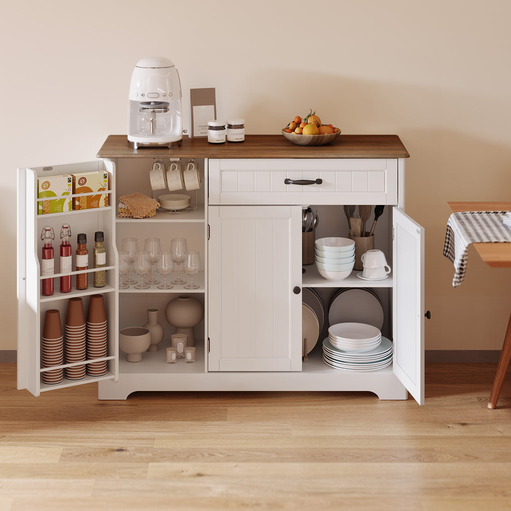 🍩【Spacious Storage Space】This dining sideboard measures 15.6"D x 42.3"W x 33.1"H and features a spacious top surface that can accommodate kitchen appliances such as coffee makers, coffee pots, and microwaves. The 13.8-inch deep drawers provide ample space for your utensils, spoons, and spices. Inside, there are 5 storage compartments of different sizes to hold various appliances, spice jars, plates, and other kitchen items to meet all your storage needs. Additionally, there are 3 extra shelves on the cabinet doors for placing snacks like milk, bread, nuts, and cereal.