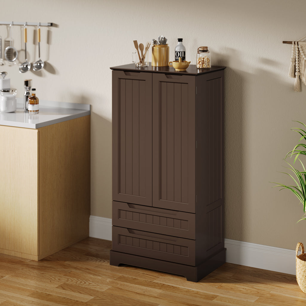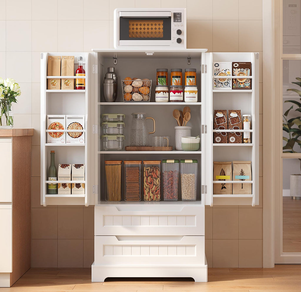 🌳【Multifunctional Design】Features two door shelves for quick access to snacks, condiments, or breakfast items—grab a cereal box or ketchup bottle without rummaging. Two smooth drawers tuck away utensils or packaged foods, while three shelves organize everything from pasta to snacks. The top surface holds microwaves or coffee makers, turning it into a mini breakfast station for busy mornings.
