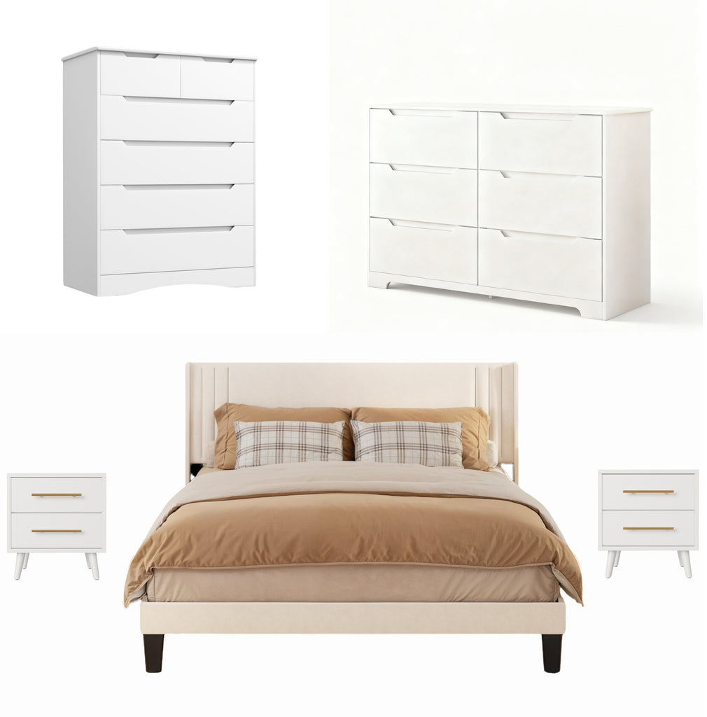 A Cohesive Look:Ā All pieces feature a clean, modern design in a unified white finish (with a beige fabric headboard) that blends seamlessly with any decorāfrom contemporary to mid-century.