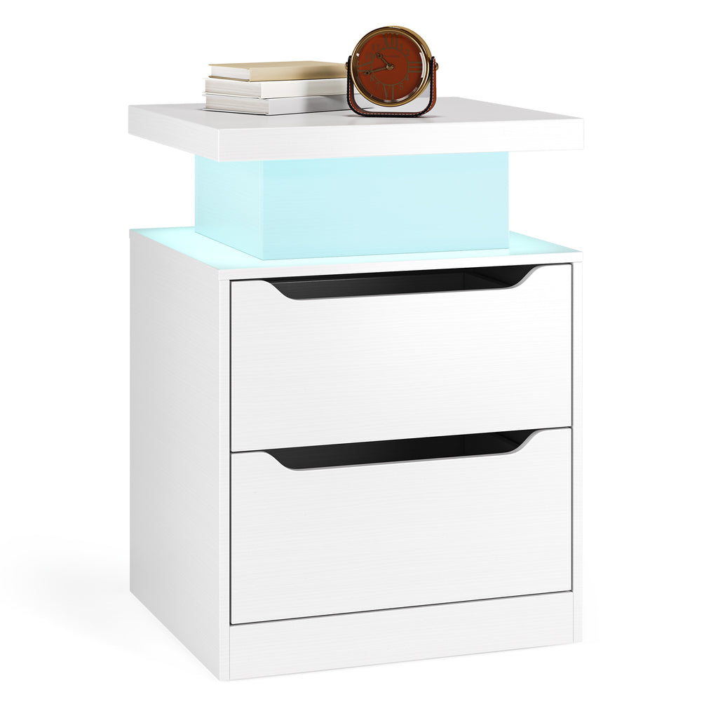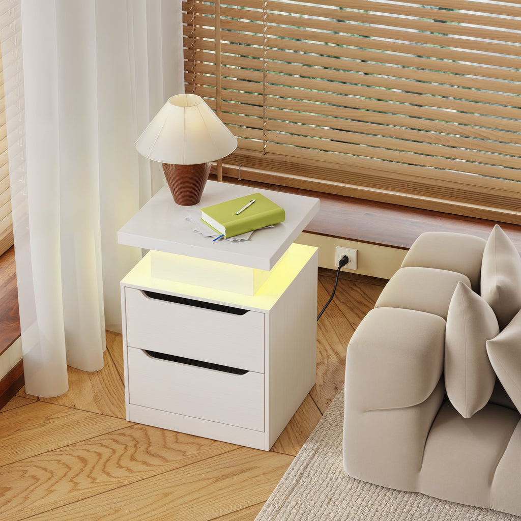 Asofer Nightstand with Charging Station, 2 Drawers, LED Lights - Modern Wood Bedside Table,White