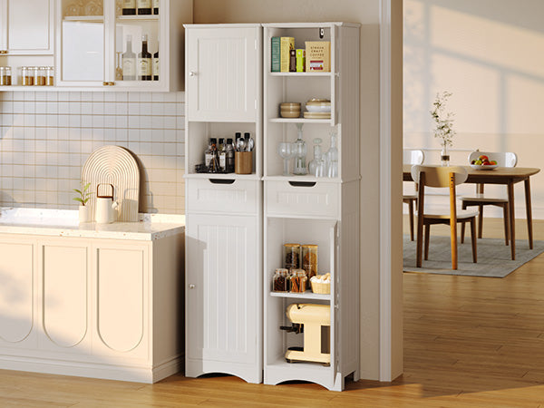 🛁【Modern and Stylish Design】 Featuring an elegant appearance with open storage and drawers, the cabinet offers both storage and display functions while adding contemporary charm to any room. It effortlessly blends with various decor styles.