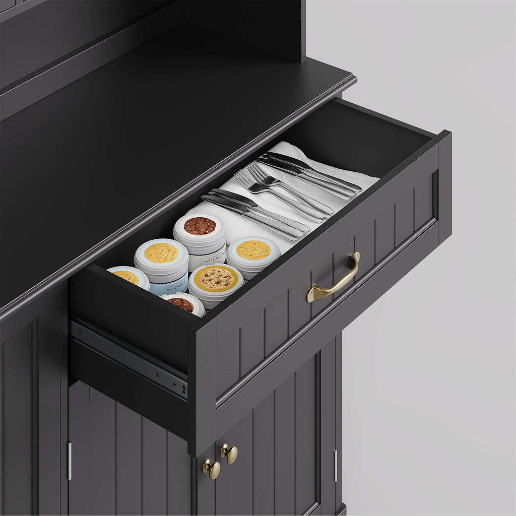 🎁【Personalized Design】The top of this sideboard has two adjustable cabinets, allowing you to customize your storage needs. There is a power cord storage hole in the middle, enabling you to use your coffee maker or microwave while keeping the countertop neat and tidy. On the left, there is also a hanging wine glass rack to avoid the awkward situation of accidentally breaking glassware.