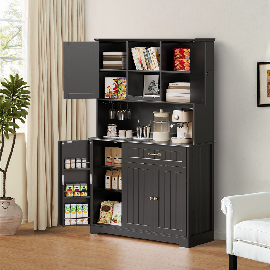 🎄【16 Storage Units】This kitchen storage cabinet features multiple storage units, including 2 adjustable cabinets, open space, a wine rack, a glass rack, an open dining table, a door rack, a rectangular cabinet, and drawers. It meets all your kitchen and dining room storage needs, keeping your spices, plates, snacks, and wine bottles organized!