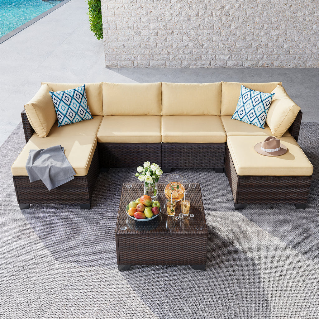 Asofer 7-Piece Patio Furniture Set with Rattan Sofa & Thickened Cushions & Coffee Table for Garden, Backyard, Beige
