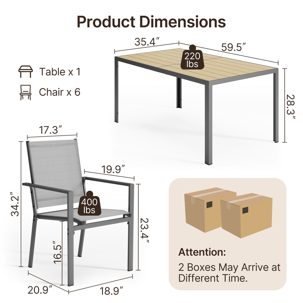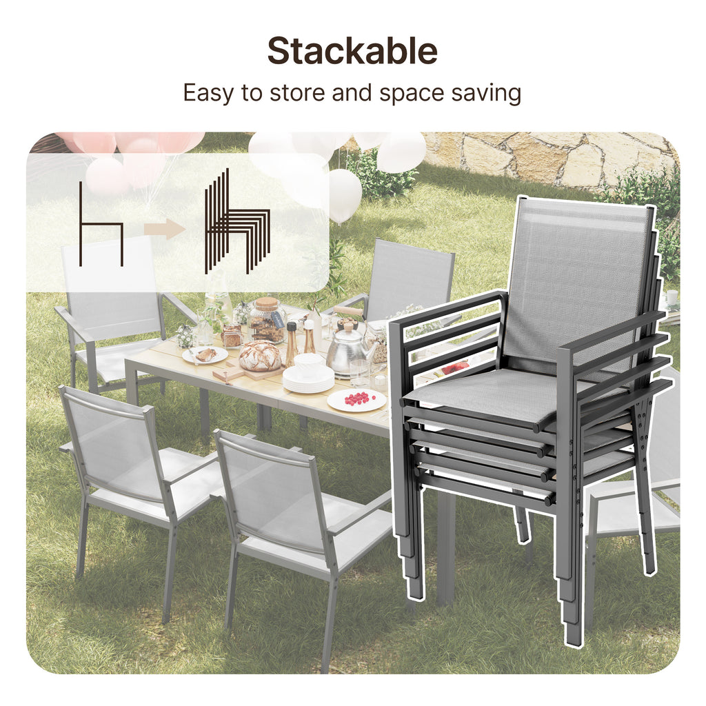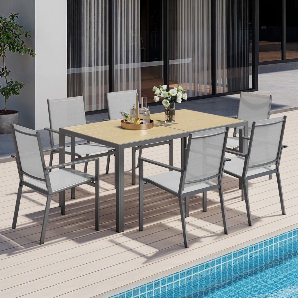 Asofer 7 Pieces Outdoor Patio Dining Set, 1 Rectangle Steel Square Table & 6 Stackable Textilene Chairs, Gray