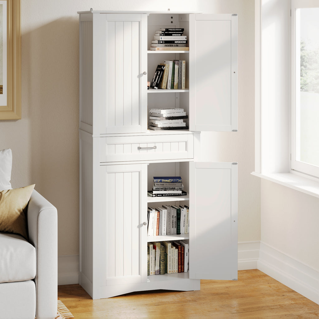 Asofer 71 Inch Tall Kitchen Pantry Cabinet with 4 Doors, Adjustable Shelves & 15" Deep Drawer, White