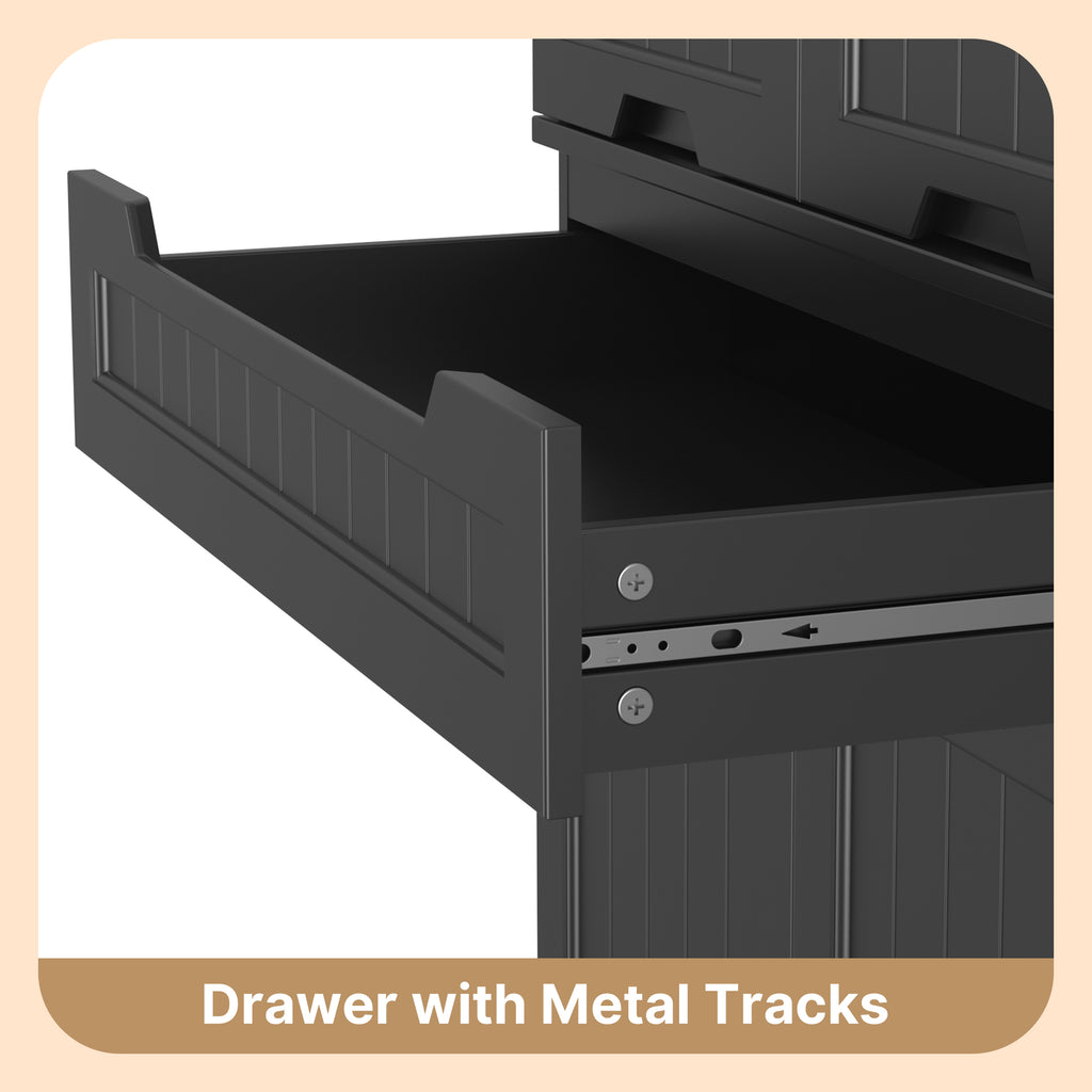 Six additional shelves behind the stylish barn door at the top - perfect for spices, canned goods, and utensils!