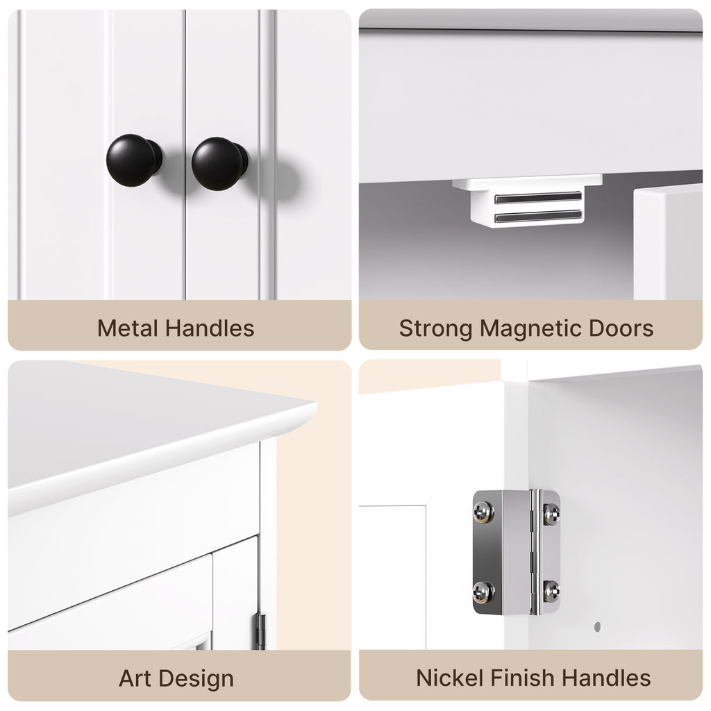 🧻[High-Quality Materials] The wall-mounted cabinet is made of high-quality fiberboard (MDF) - a dense, warp-resistant engineered wood - and features two doors, black metal handles, and knobs for easy opening and closing. The high-quality materials are finished with pure white paint, making it waterproof, moisture-resistant, and durable, suitable for use in bathrooms or kitchens.