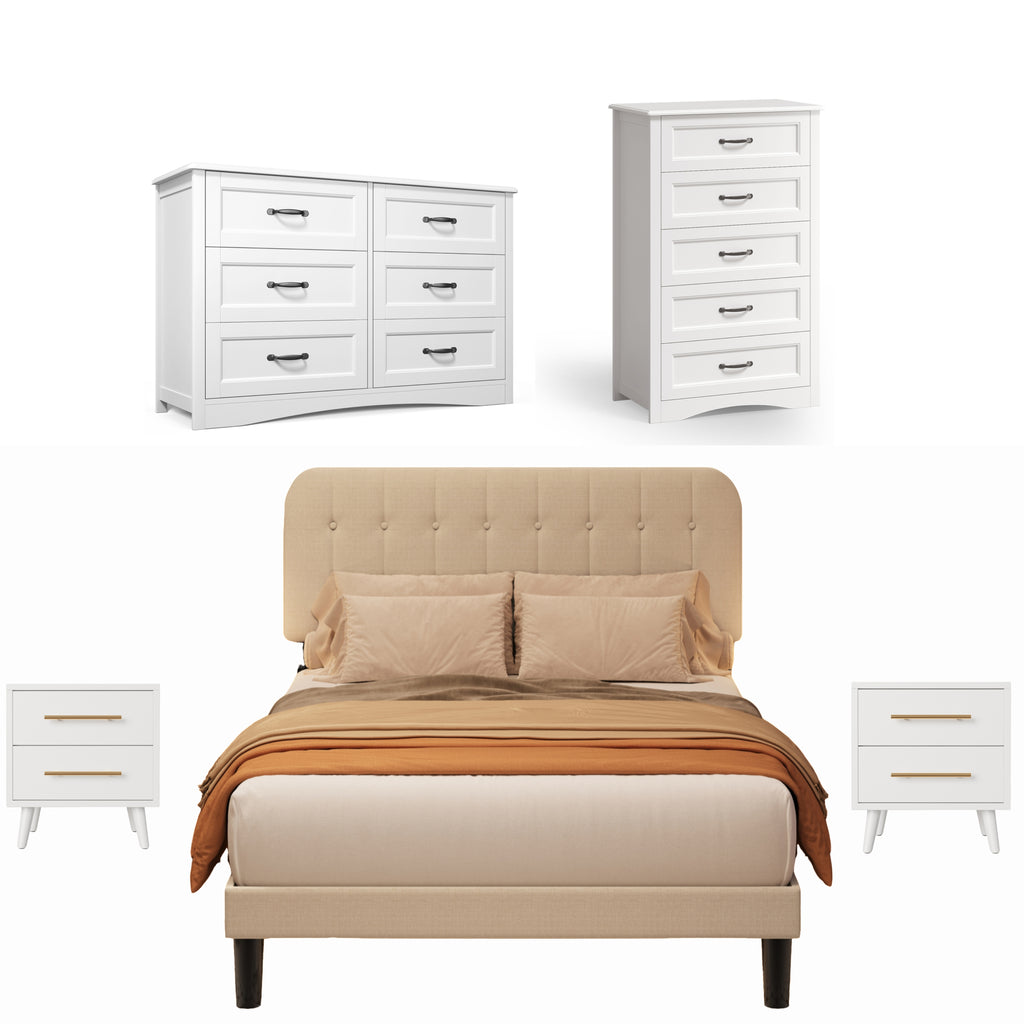 The clean, minimalist white finish with modern silhouettes and elegant metal handles complements any decor style—from Modern and Mid-Century to traditional. The bed frame's adjustable, upholstered beige headboard adds a touch of softness and comfort, perfectly coordinating with the white furniture.