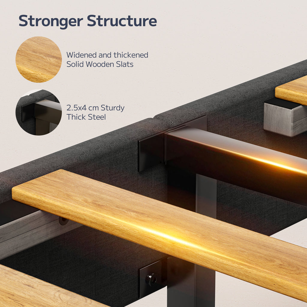 • Material: Premium Upholstery + Reinforced Steel + Solid Wood Slats