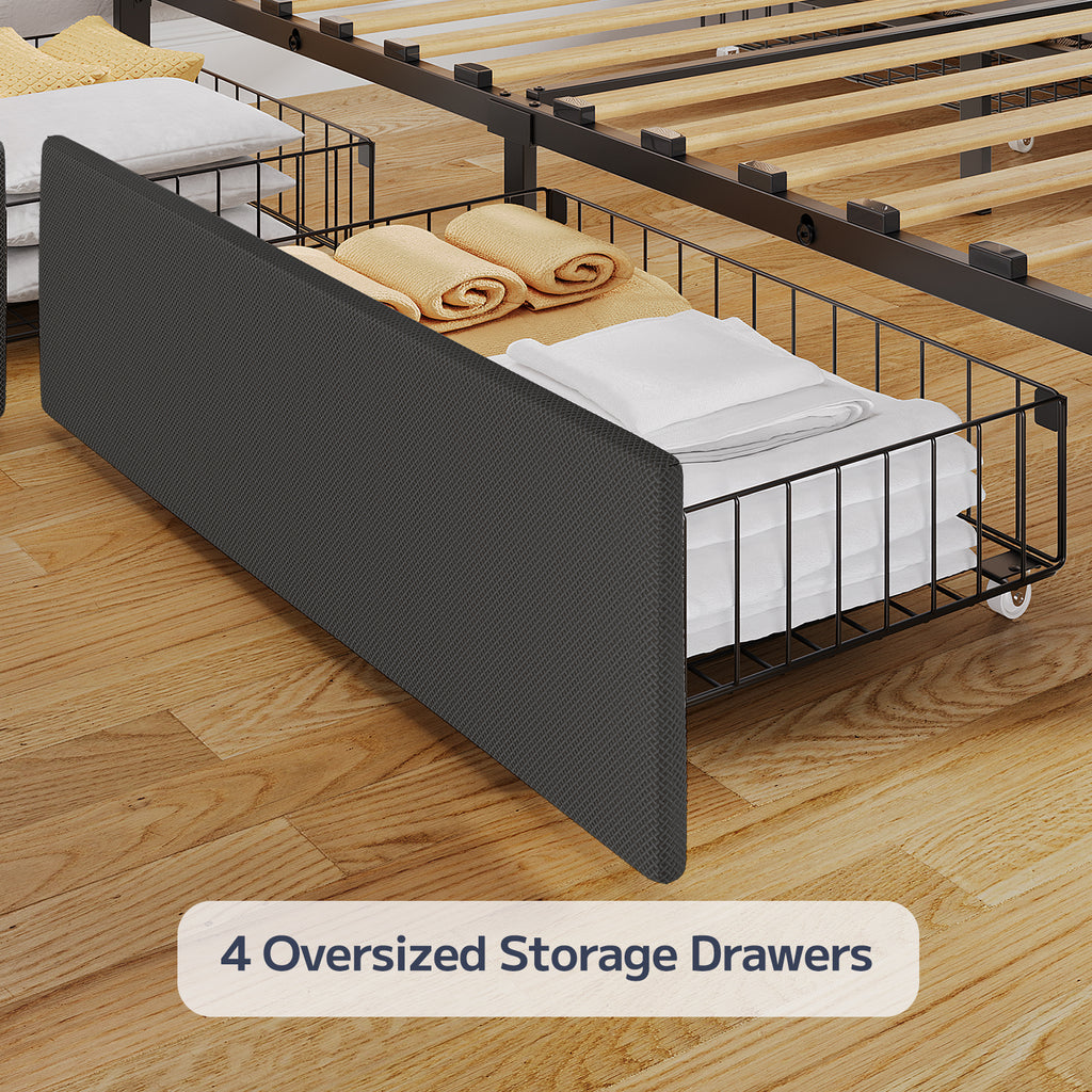 📦【Ample Storage Drawers】The bed frame is equipped with 4 wheeled storage drawers, allowing you to store extra bedding, clothes, or essentials under the mattress by simply sliding out the drawers, saves space and keeps your home organized.