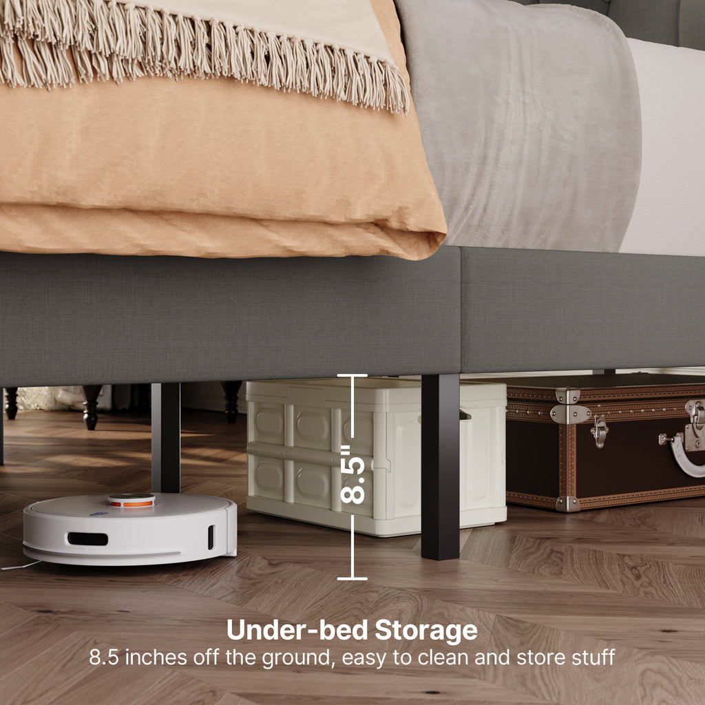 ✨【Smart Storage】Offering 8.5 inches of clearance, this full-size bed frame creates valuable under-bed storage space for luggage, shoeboxes, and more. The design allows a robot vacuum to easily pass through, keeping your room tidy while saving space.