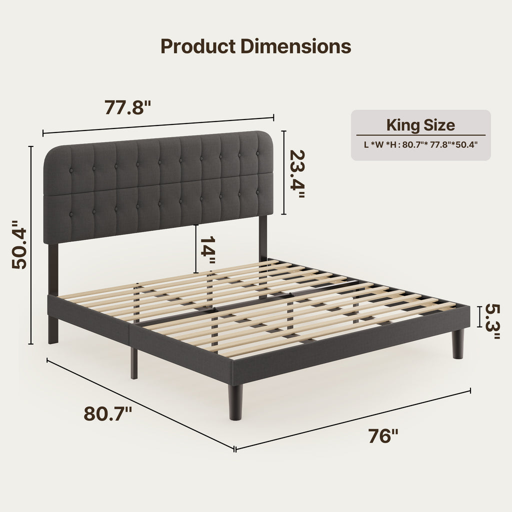 ✨【Adjustable Headboard】This full-size bed frame, measuring 80.7" L x 77.8" W x 50.4" H, combines comfort and elegance with its adjustable linen headboard, designed to fit 8-12" mattresses. With high-density sponge padding, it ensures lasting comfort whether you're reading or watching TV.
