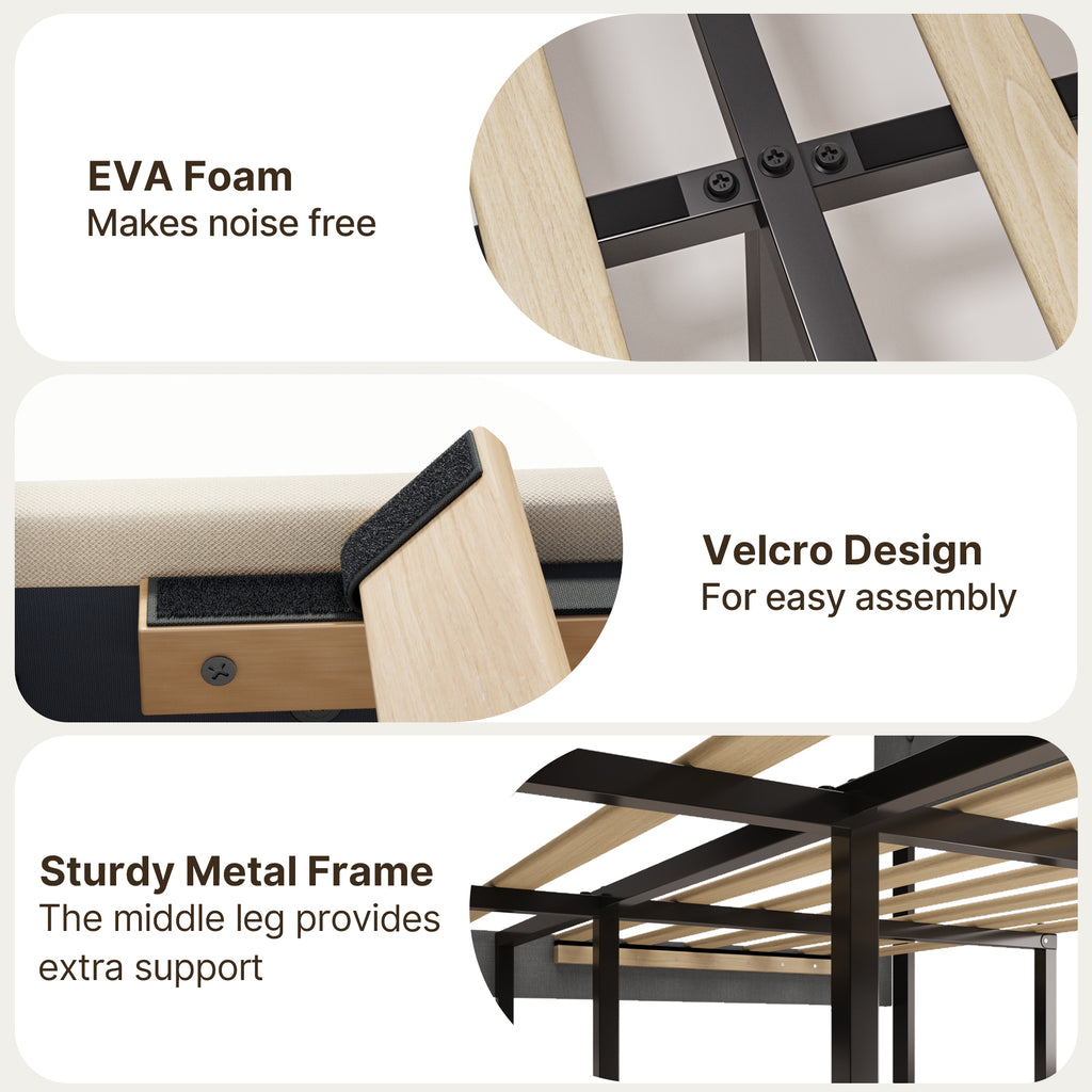 ✨【Sturdy and Silent】Built with 12 solid wood slats and a robust metal frame, this full bed frame can support up to 850 pounds with 8 support points. Equipped with EVA foam and velcro, it minimizes movement and reduces noise, eliminating squeaks caused by friction between the wood and metal, ensuring a peaceful sleep.