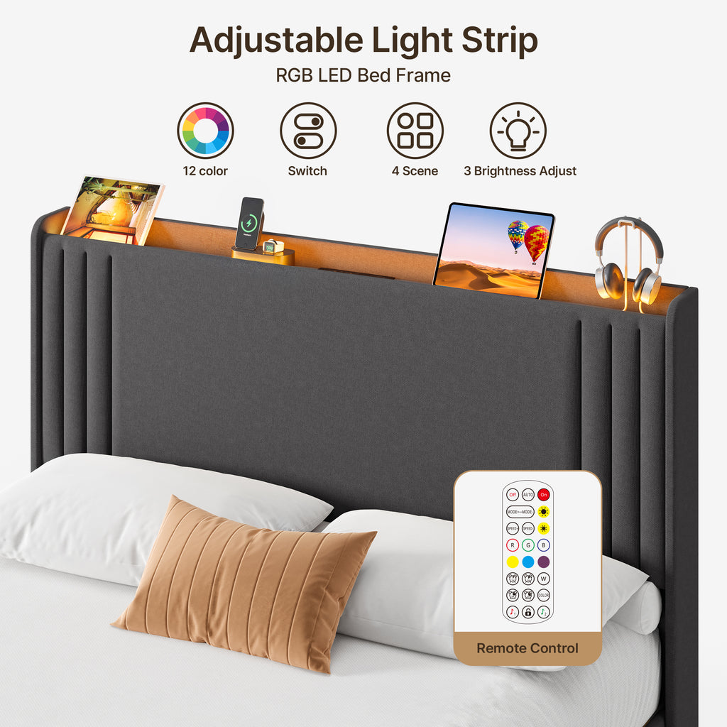 Asofer Queen Bed Frame with Charging Station and LED Lights,Upholstered Wingback Platform Bed with Wooden Slats,Dark Gray