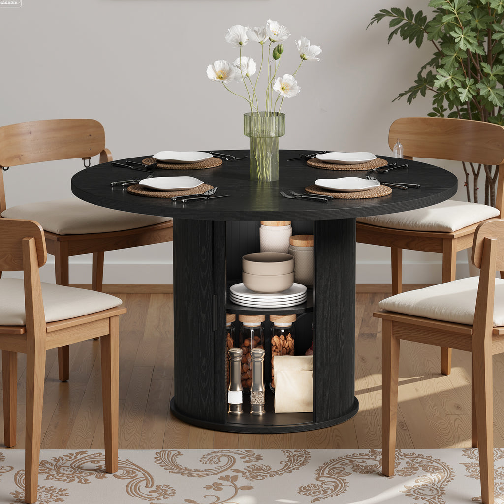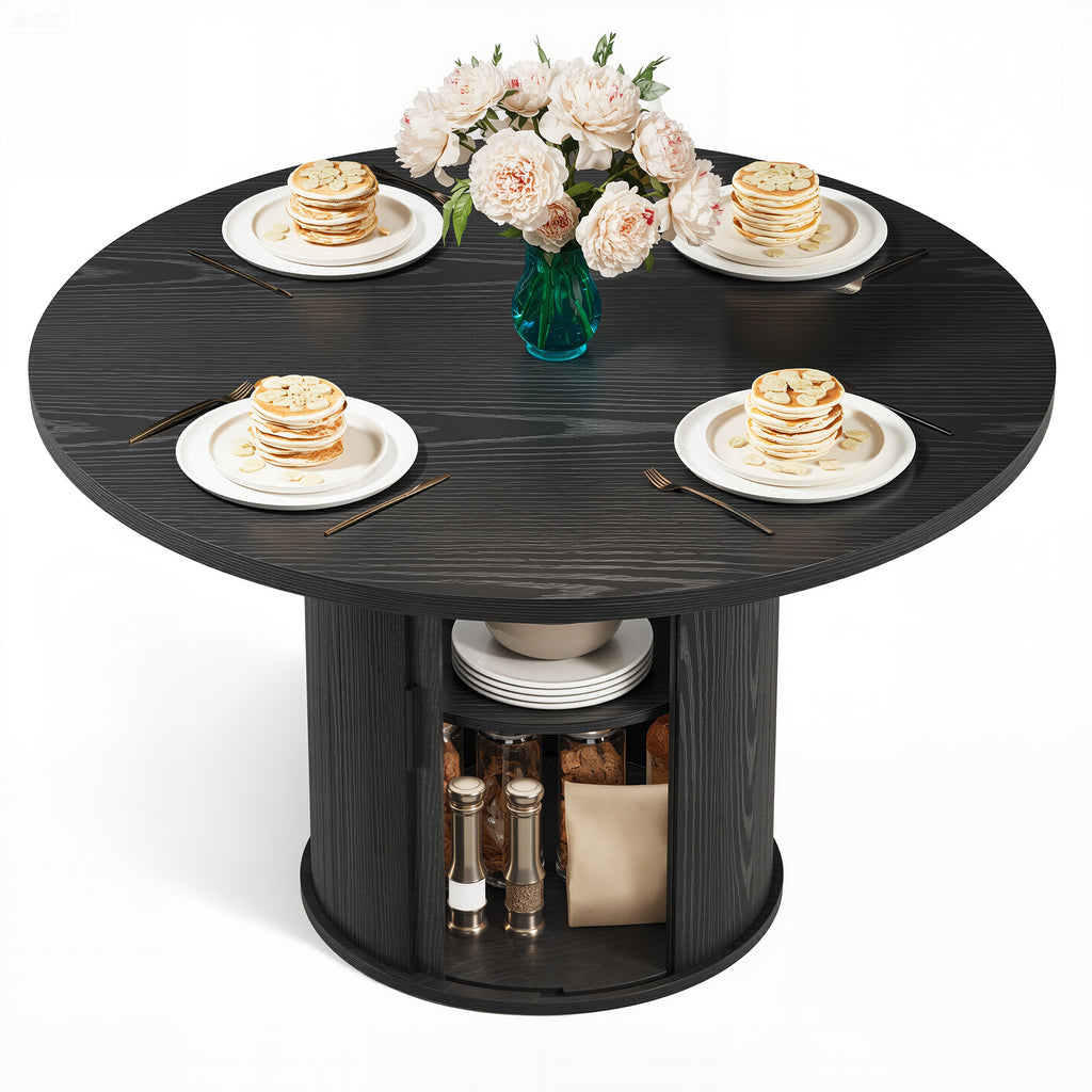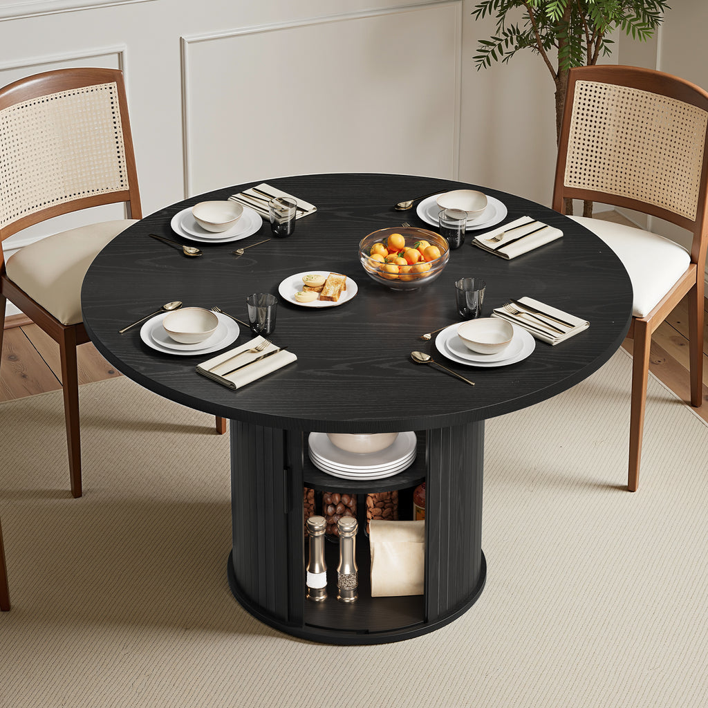 Asofer Round Dining Table for 4, Circle Dining Table with 2-Layer Storage and Smooth Sliding Wood Doors, Iron Strip Frame Base for Kitchen Living Room, Black