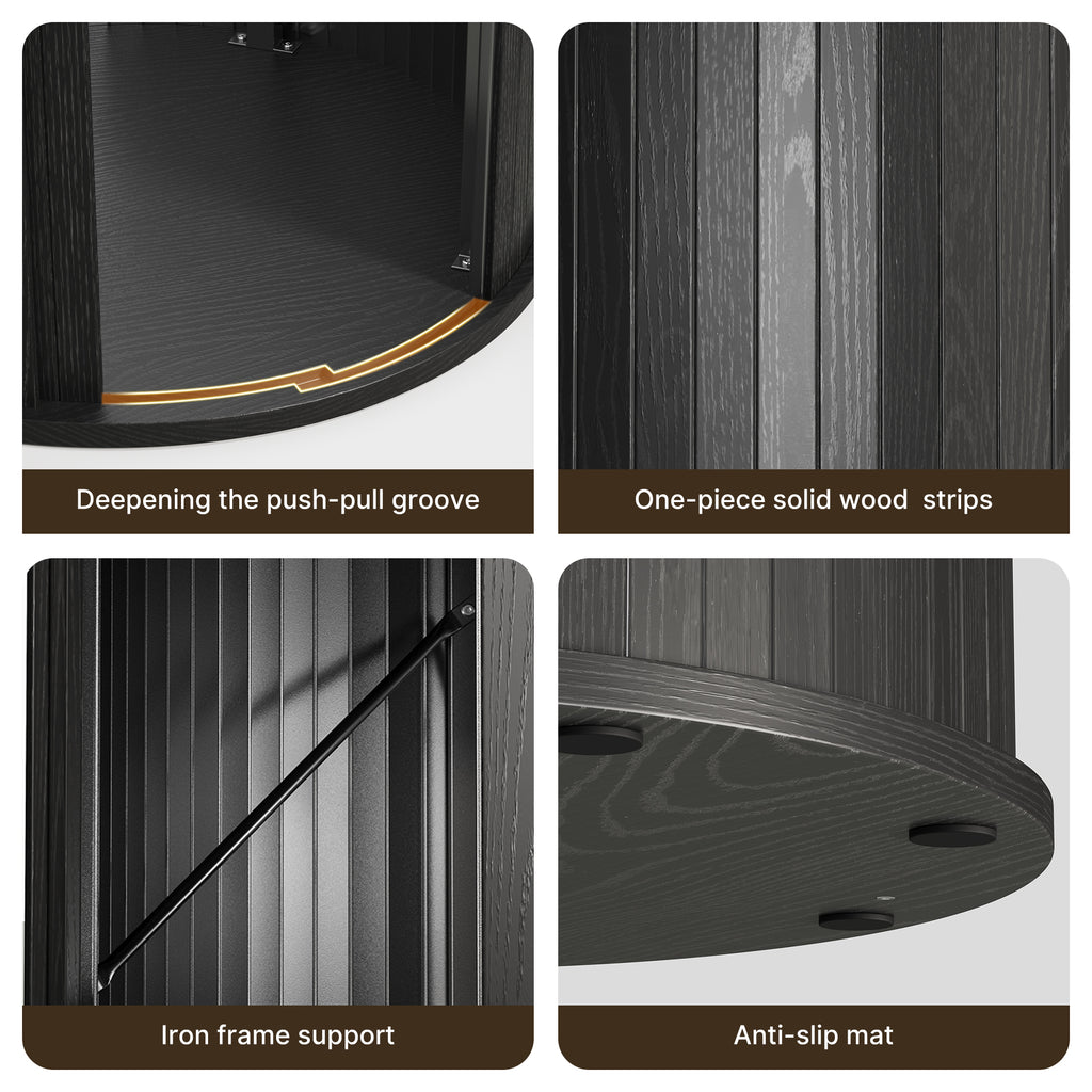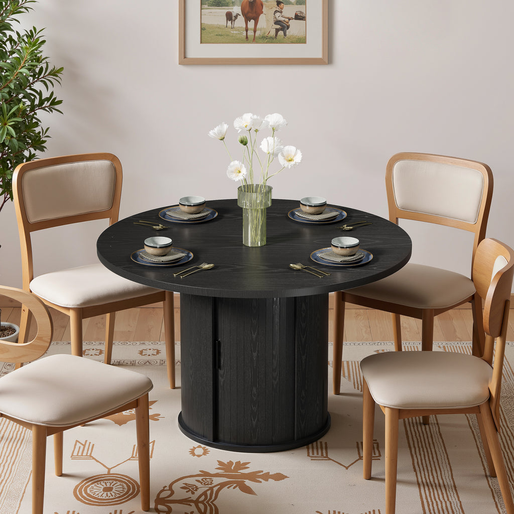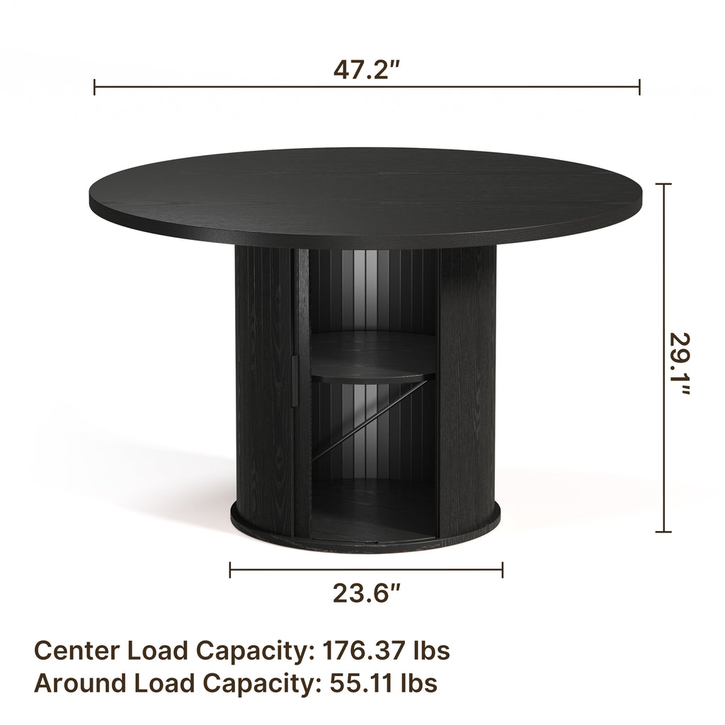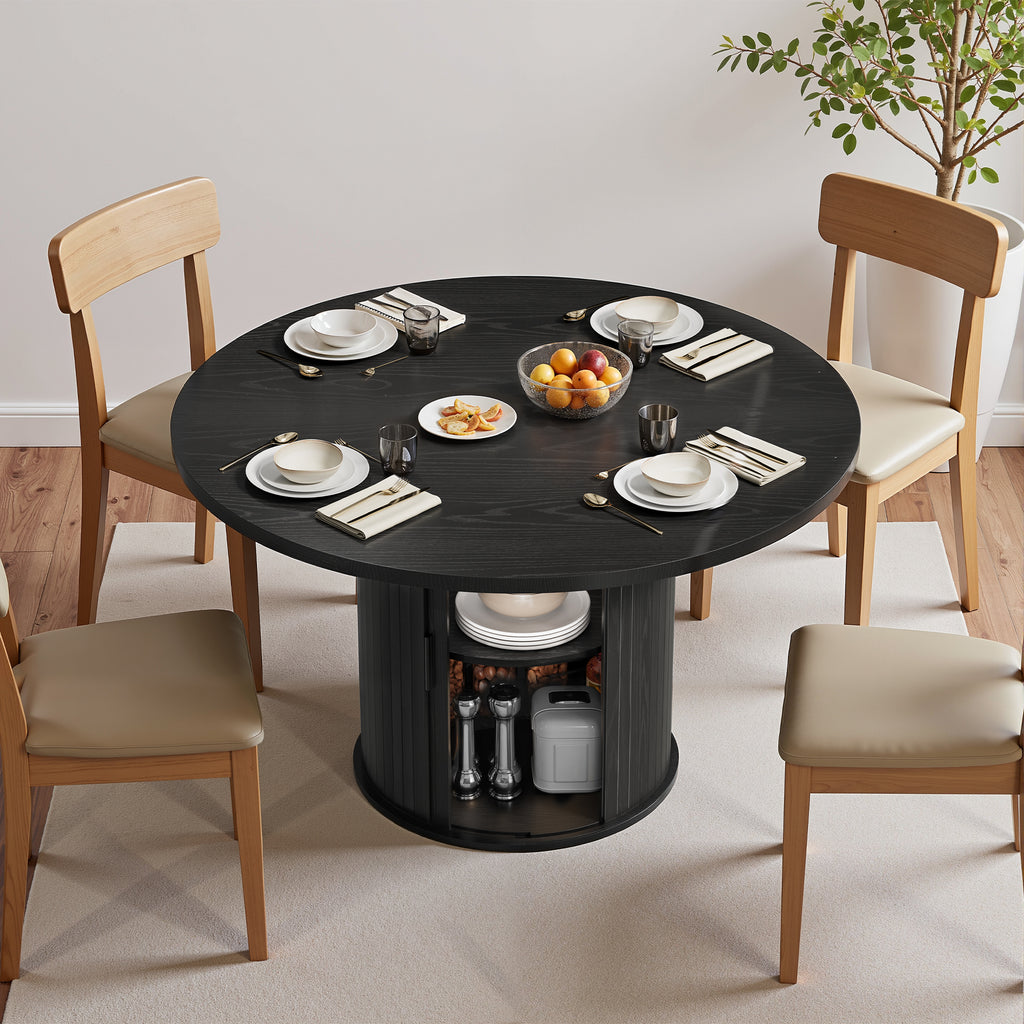 Asofer Round Dining Table for 4, Circle Dining Table with 2-Layer Storage and Smooth Sliding Wood Doors, Iron Strip Frame Base for Kitchen Living Room, Black