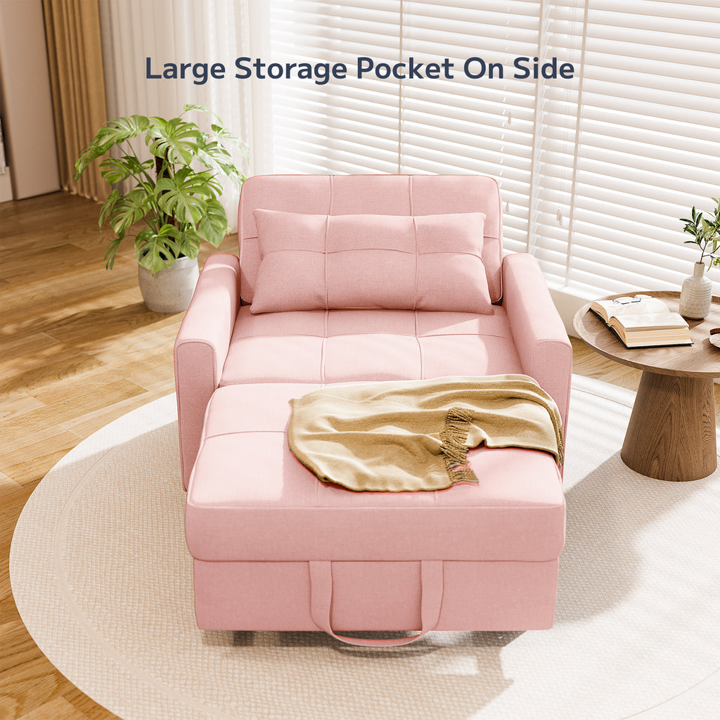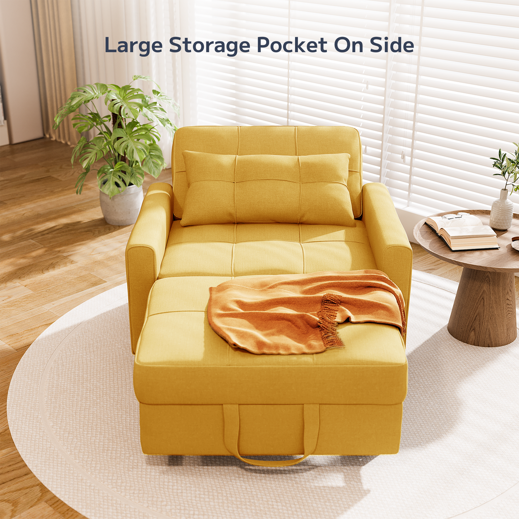 Adjustable backrest & armrests transform it into a sofa bed, lounge chair, or armchair. High-density memory foam and soft, breathable fabric offer tailored support for naps, work, or relaxation. Detachable cotton pillow boosts lumbar/neck support. Durable hardwood frame with chrome legs and floor-safe casters ensures stability. Side storage pockets + easy assembly. Perfect for small apartments, home offices, or guest rooms. Sleek, space-saving design. Redefine comfort in compact spaces!