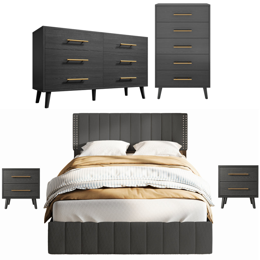 Asofer Ultimate Storage Bundle: Queen Bed with 4 Drawers, 6 & 5-Drawer Dressers & 2 Nightstands, Black