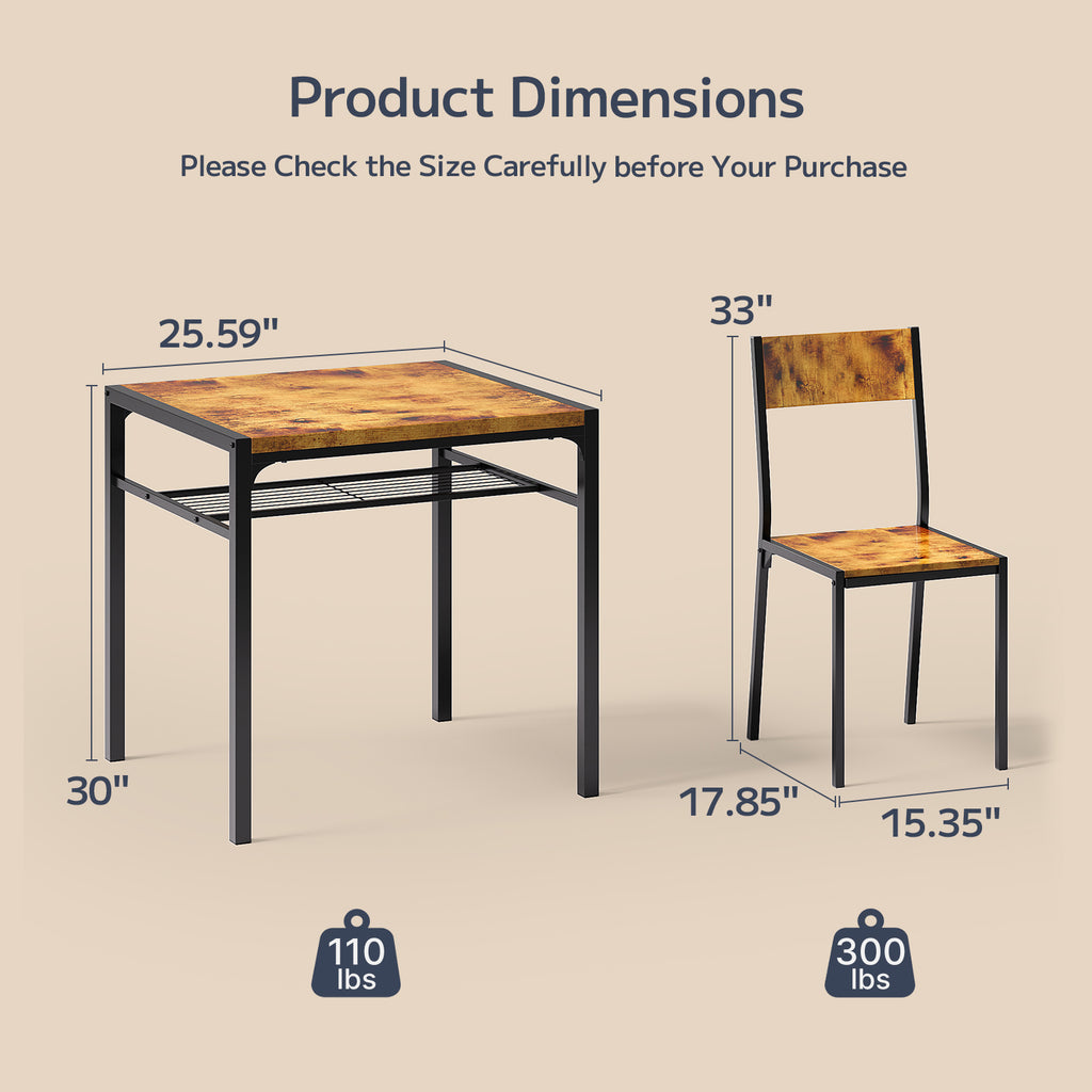 <p>😃<strong>【Space-Saving Design】</strong>This dining set includes 1 table and 2 chairs, perfect for small spaces. Table dimensions: 29.6 inches long &times; 29.6 inches wide &times; 30 inches high; chair dimensions: 15.4 inches long &times; 15.8 inches wide &times; 36.4 inches high. The chairs can be neatly tucked under the table when not in use, saving space.</p>