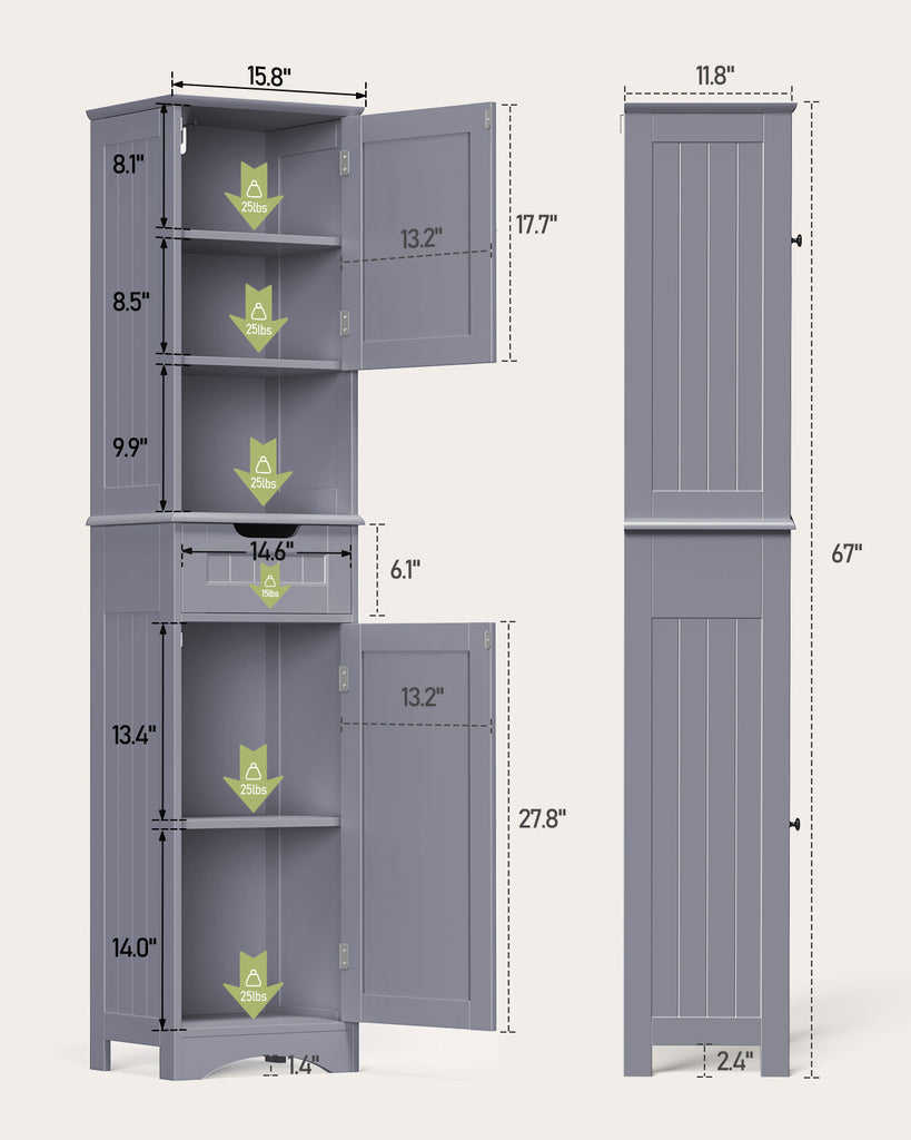 This Aiho 67-inch tall bathroom storage cabinet is an ideal storage solution that is both stylish and functional. Its elegant white design makes it the perfect accessory for any bathroom, bedroom or kitchen. Efficiently utilizing space, the narrow tower features 1 open storage area, 2 doors, and 1 drawer, providing ample storage for your daily necessities. Whether it's towels, toiletries or kitchen utensils, this storage cabinet will help you stay neat and organized. The durable material ensures long-lasting use, making it a superior product for enhancing the efficiency of your home storage.