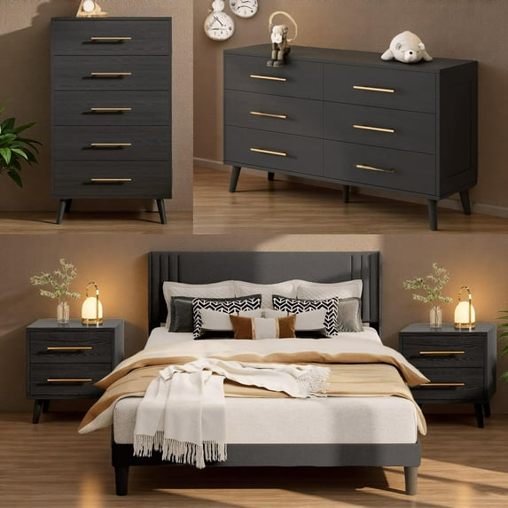 Transform your bedroom into a sleek sanctuary with this modern and sophisticated bedroom set. Crafted with meticulous attention to detail, this suite features a luxurious full-size deep gray wingback bed frame that adds both comfort and elegance. Complemented by two stylish black nightstands with integrated LED lighting, a chic black five-drawer dresser, and a spacious six-drawer dresser, this collection offers the perfect blend of functionality and contemporary design. Whether you're redecorating or upgrading your sleep space, this suite is designed to meet your needs and elevate your home décor.
