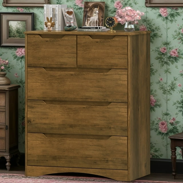 Brown 5 Drawer Dresser, Lofka Space-Saving Dresser for Bedroom with Cutout Handles, Chests of Drawers for Living Room