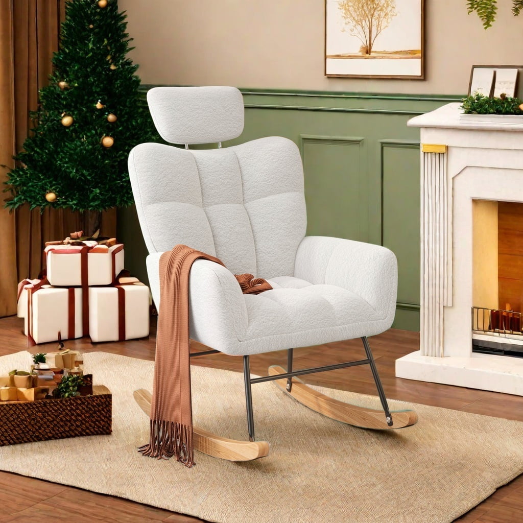 Rocking Chair Nursery, Lofka Teddy Upholstered Glider Rocker with High Backrest, Accent Chair with Comfy Armchair with Padded Seat for Living Room (White Teddy)