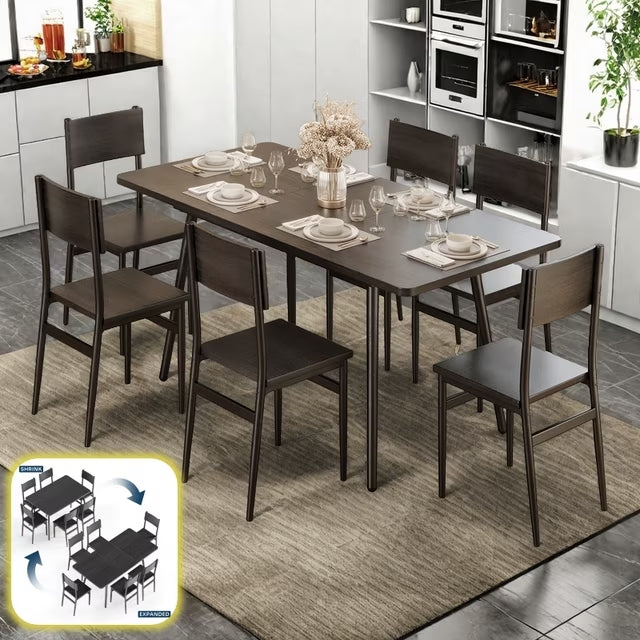 Lofka 7-Piece Dining Table Set for 4-6 People, Extendable MDF Wood Kitchen Table with 6 Wooden Chairs, Black - Space-Saving