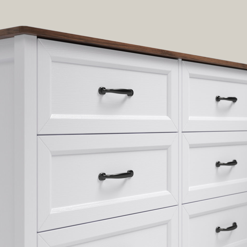 Experience rustic charm and versatile storage with the Aiho Farmhouse Dresser. This 47.2" wide, six-drawer wooden dresser is perfect for bedroom, living room, hallway, or closet use. Its tall design provides ample space for clothes, accessories, or decorations, helping keep your space neat and organized. The stylish metal handles add a modern touch, seamlessly blending vintage warmth with contemporary fashion. Whether as a bedroom storage unit or a TV stand for a 50-inch TV, the Aiho Farmhouse Dresser combines practicality and aesthetic appeal to elevate your home decor.