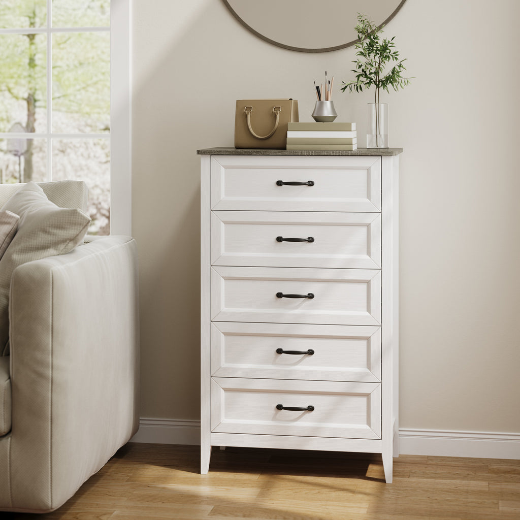 Farmhouse Dresser for Bedroom, Tall Wood Dresser with 5 Drawer, Chest of Drawers with Metal Handle for Living Room, Hallway, Closet - Gray Desktop