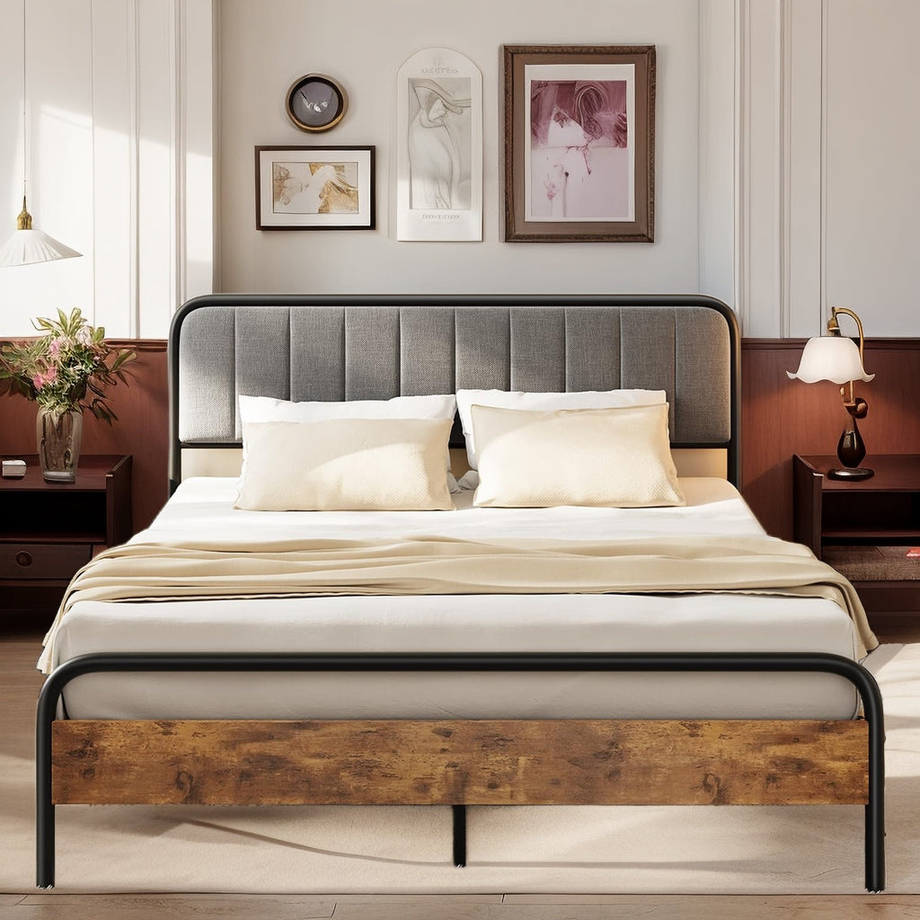Lofka Full Bed Frame with Upholstered Headboard and Wooden Footboard-Gray