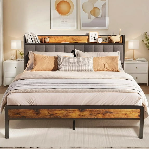 Full Bed Frame with Storage Headboard Camas Full Size, Metal Platform Bed Hold 1000 lbs, Dark Gray