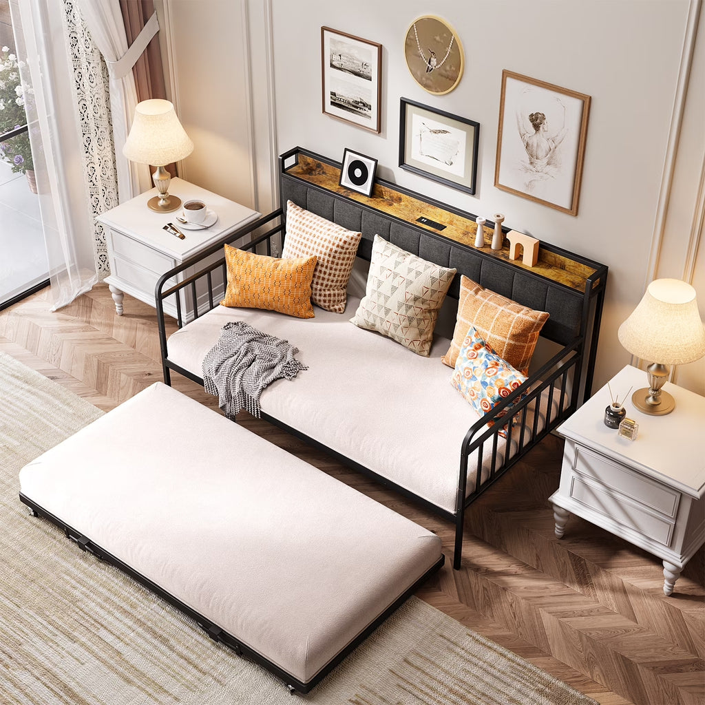 Full Daybed with Trundle, Lofka Full Size Bed Frame with Upholstered Headboard and Charging Station, Height Adjustable Day Bed Pop Up Trundle Bed Twin for Bedroom