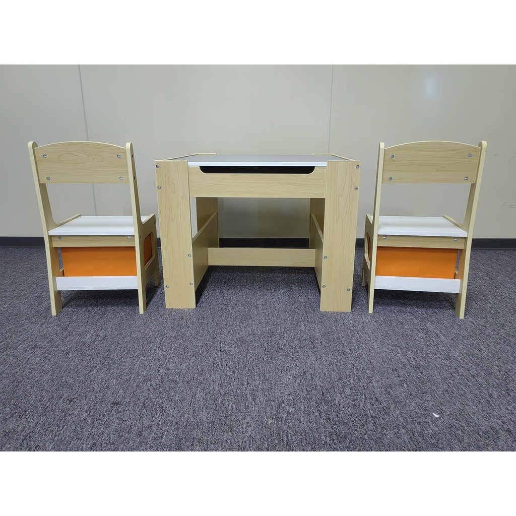kids activity table and chair set is a versatile addition to any child's playroom or bedroom, which provides endless entertainment and learning possibilities. On one side, there is a whiteboard surface that can be used for drawing, writing and playing educational games. The other side is a chalkboard surface, perfect for unleashing your child's creativity with colorful chalks. Our toddler table and chair set comes with a bookshelf on both side, providing ample space to store art supplies, toys, books and other essentials.