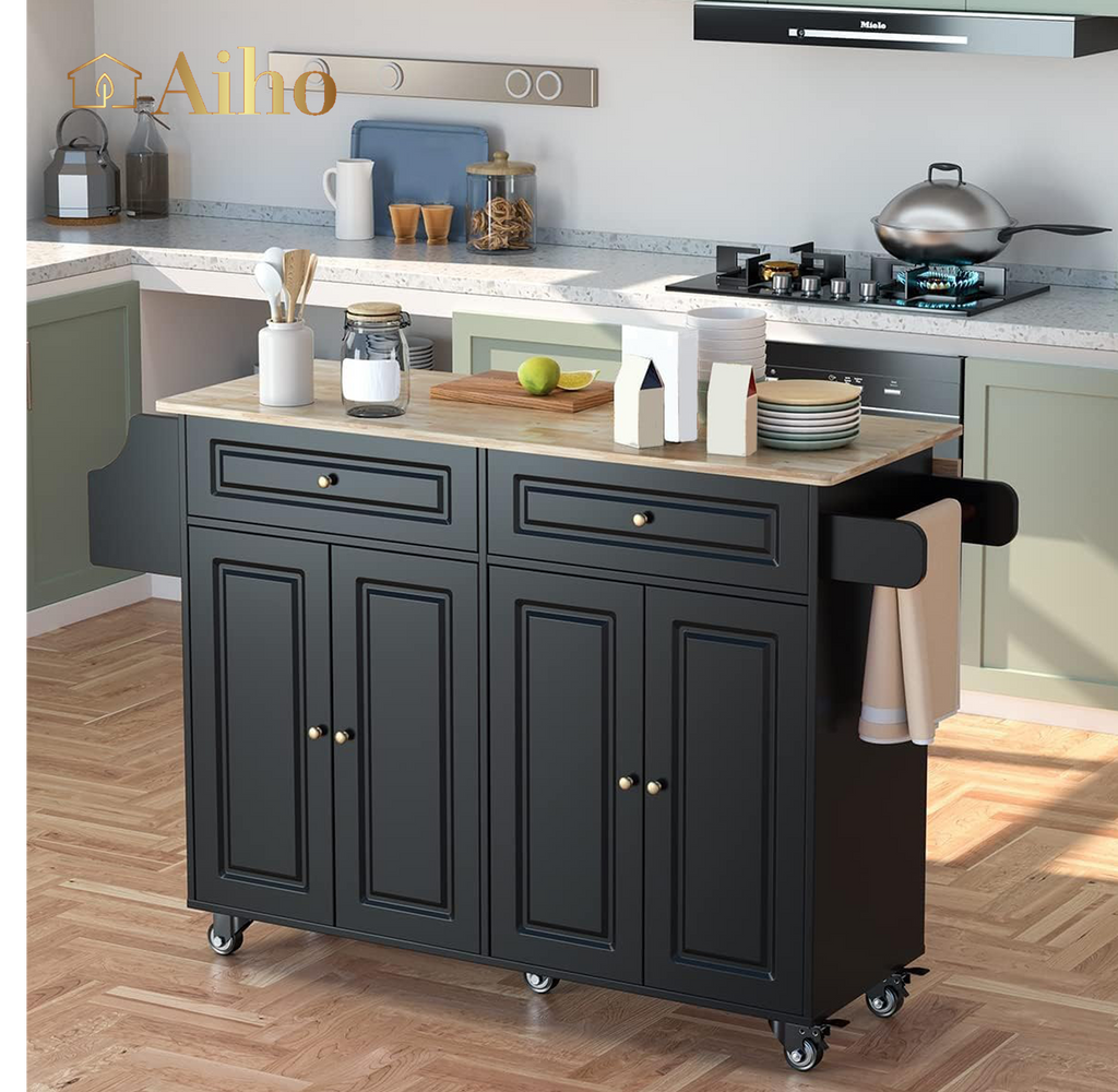 Kitchen Island with Storage, Mobile Kitchen Island Side Table on Wheels with Rubber Wood Drop-leaf Countertop , Side Rack and Drawer and for Kitchen,Dining Room - Black