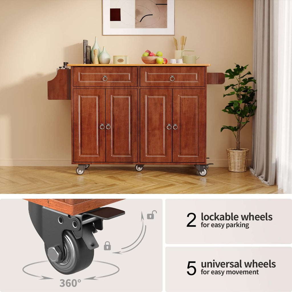 Kitchen Island with Storage, Mobile Kitchen Island Side Table on Wheels with Rubber Wood Drop-leaf Countertop , Side Rack and Drawer and for Kitchen,Dining Room - Brown